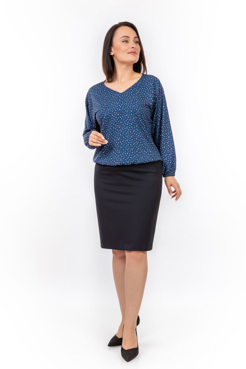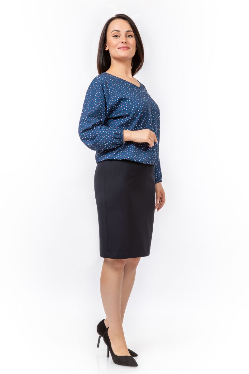 Верхний срез обработан эластичной лентой, дающей дополнительное растяжение. Вытачки на переднем и заднем полотнищах. В центральном шве заднего полотнища потайная застёжка и шлица. На подкладке.