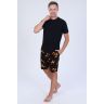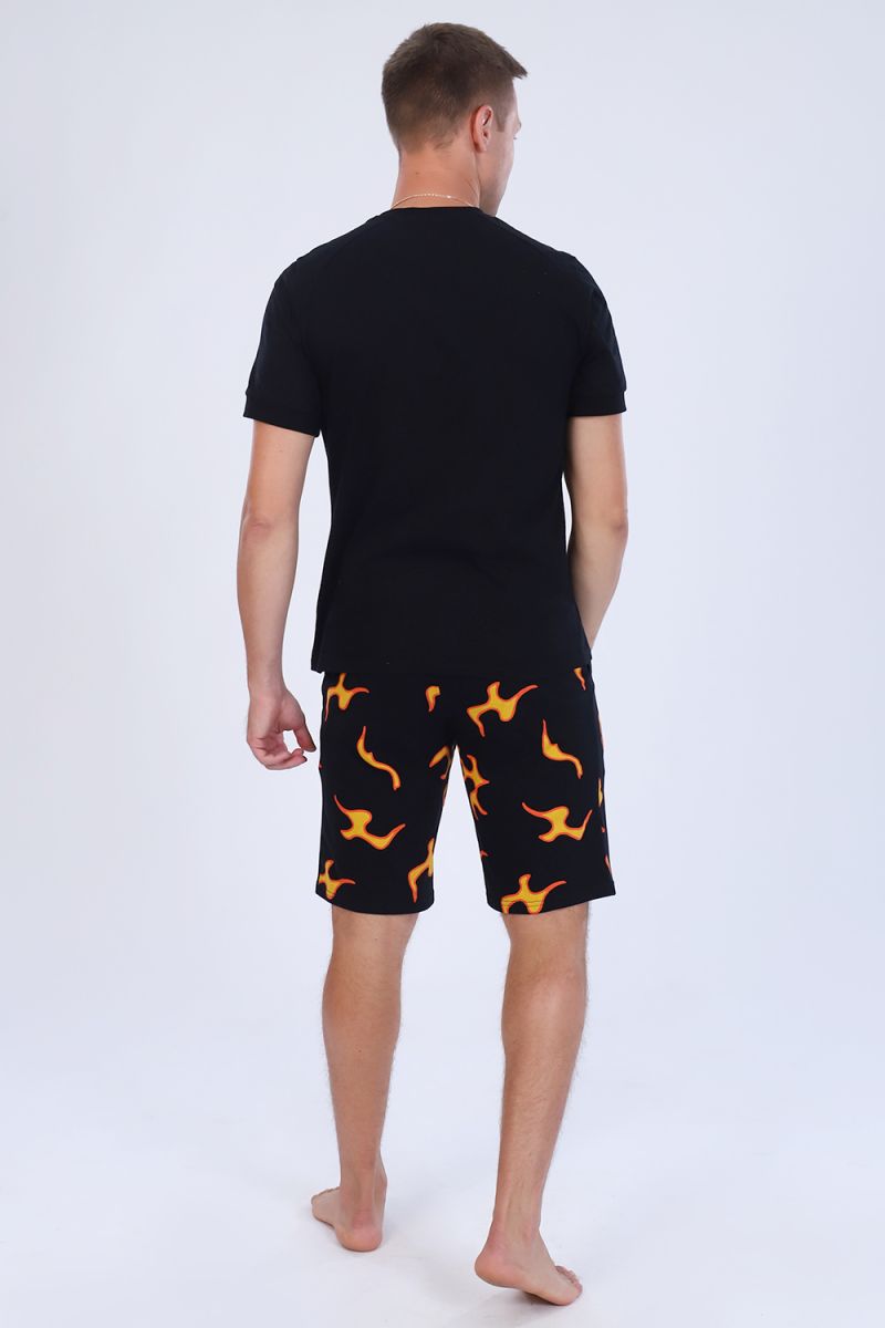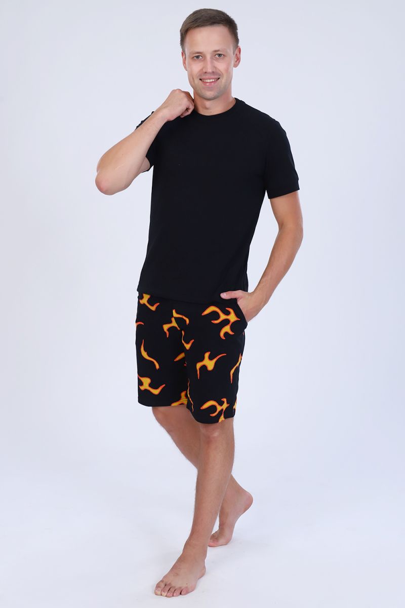 Мужской домашний комплект из натуральной ткани 100 % хлопка. Костюм состоит из футболки и шорт. Футболка из гладкокрашеного полотна, полуприлегающего силуэта с коротким втачным рукавом, на манжете, горловина округлой формы. Шорты из трикотажного полотна с оригинальным принтом, полуприлегающего силуэта с боковыми карманами и притачным поясом.