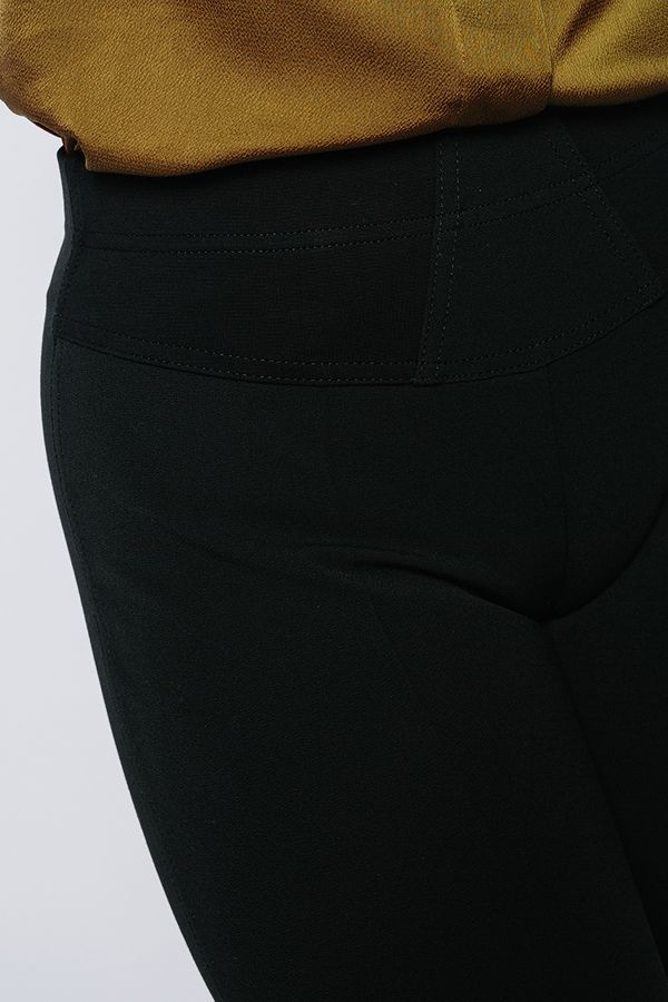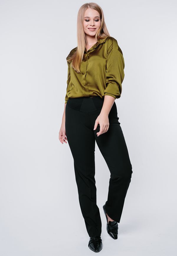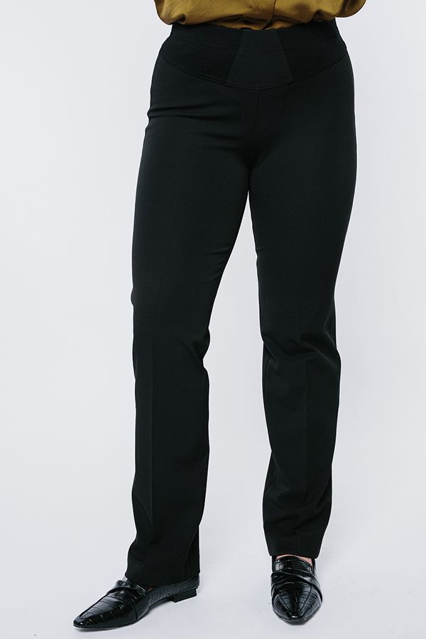 Брюки классические со стрелками, без застежки на поясе из эластичной ткани. Плотная ткань, подходит для холодного времени года. Детали: на эластичном поясе комбинированная отделка (в поясе резина 4,0 см). Практичная модель для офисных сотрудников. Идеальная посадка на фигуры больших размеров.