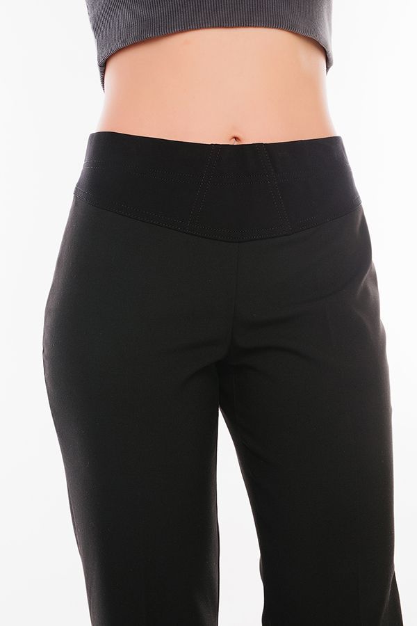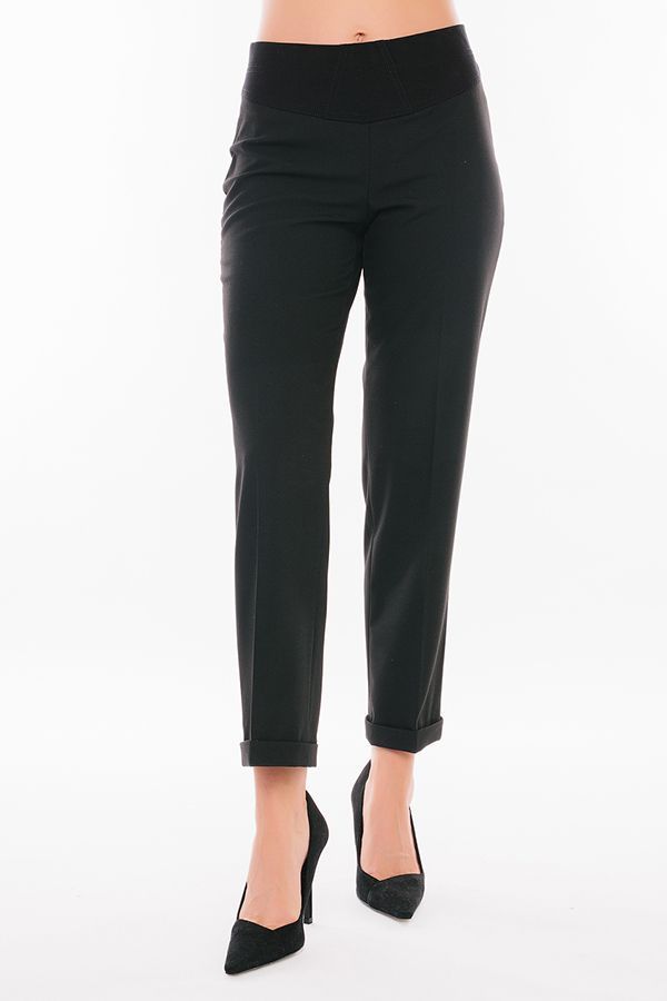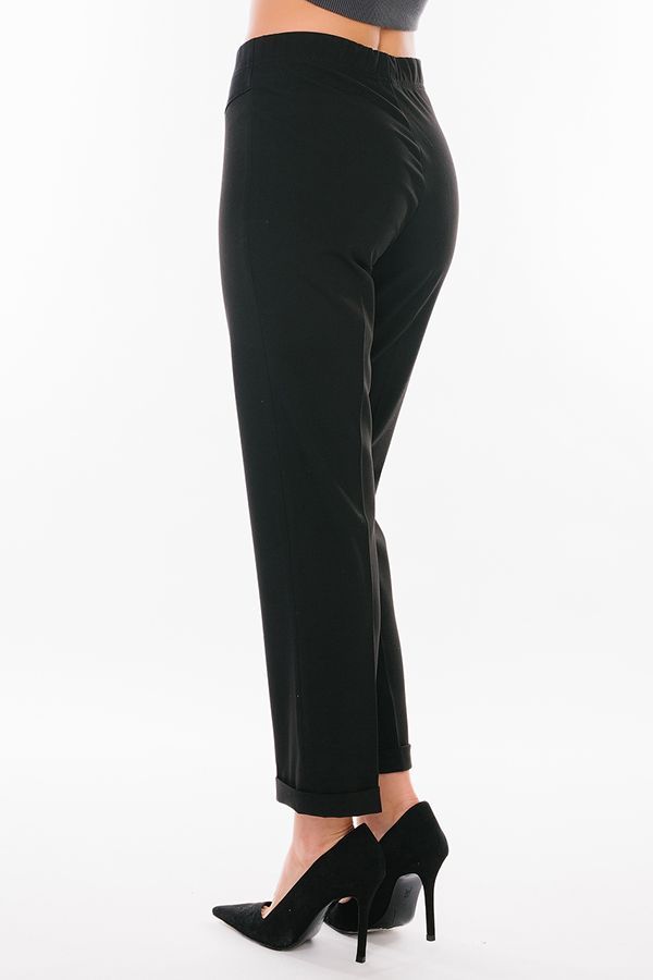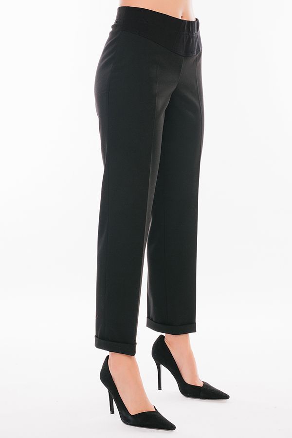 Брюки в городском стиле. Модель без застежки на поясе из эластичной ткани. По линии низа отворот, который можно использовать для изменения длины брюк.