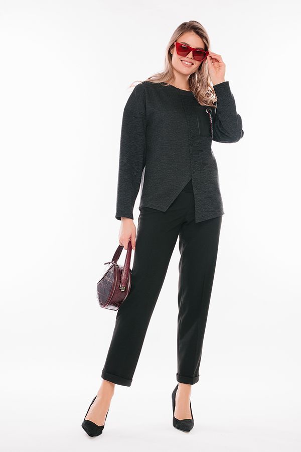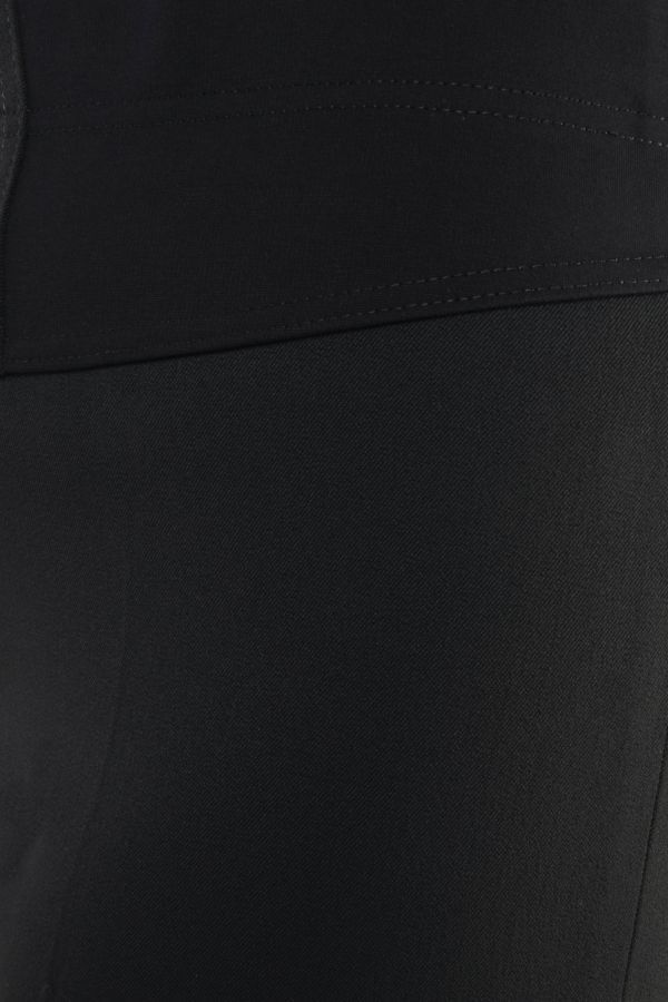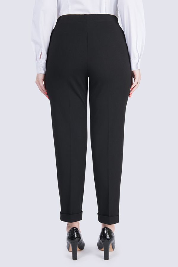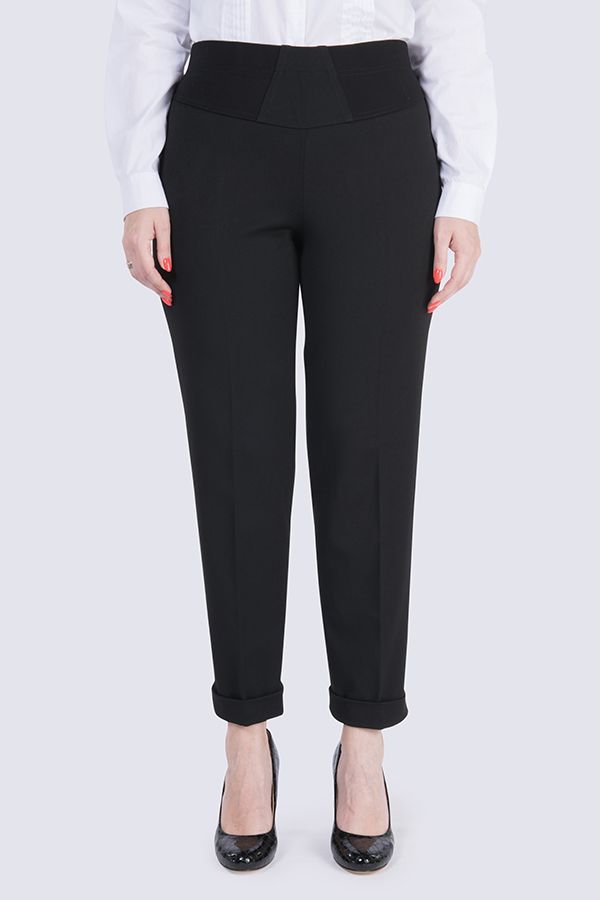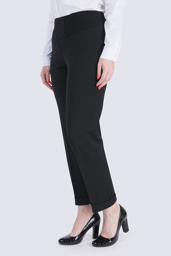 Брюки в городском стиле. Модель без застежки на поясе из эластичной ткани. По линии низа отворот, который можно использовать для изменения длины брюк.