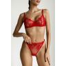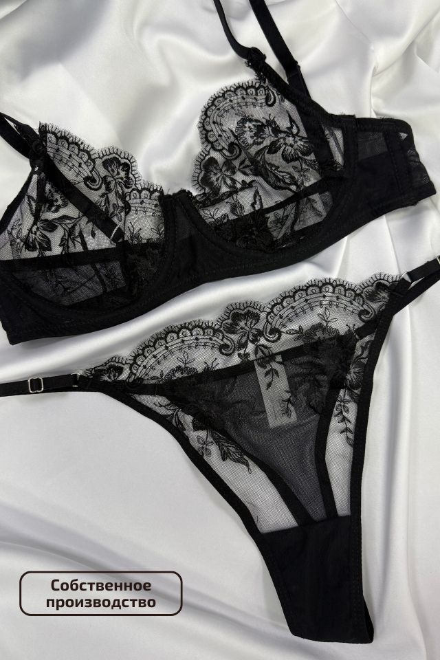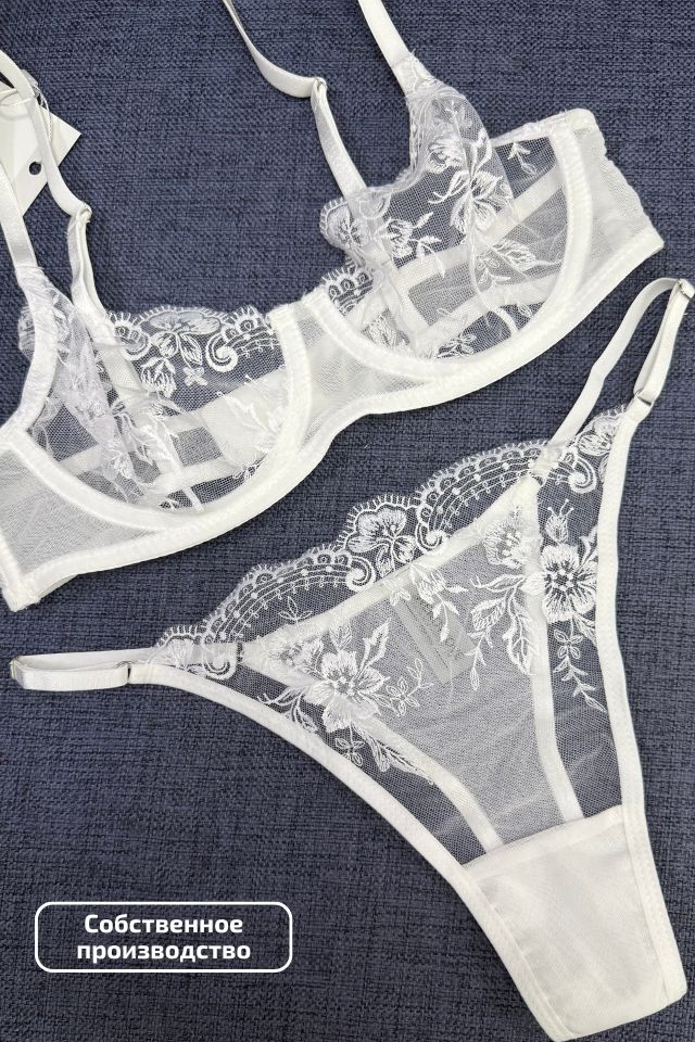 Изысканный комплект нижнего белья из тонкой сетки без поролона с нежной цветочной вышивкой создан для утончённых образов. Лёгкий и воздушный бюстгальтер на каркасах деликатно подчеркивает формы, создавая эффект невесомости. Трусики-стринги, украшенные вышивкой, добавляют чувственности.