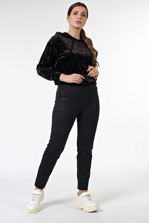Модель брюк без застежки, с имитацией гульфика. Детали: втачной пояс, по бокам карманы на потайном замке, сзади под кокеткой листочки. В пояс вставлена эластичная лента.