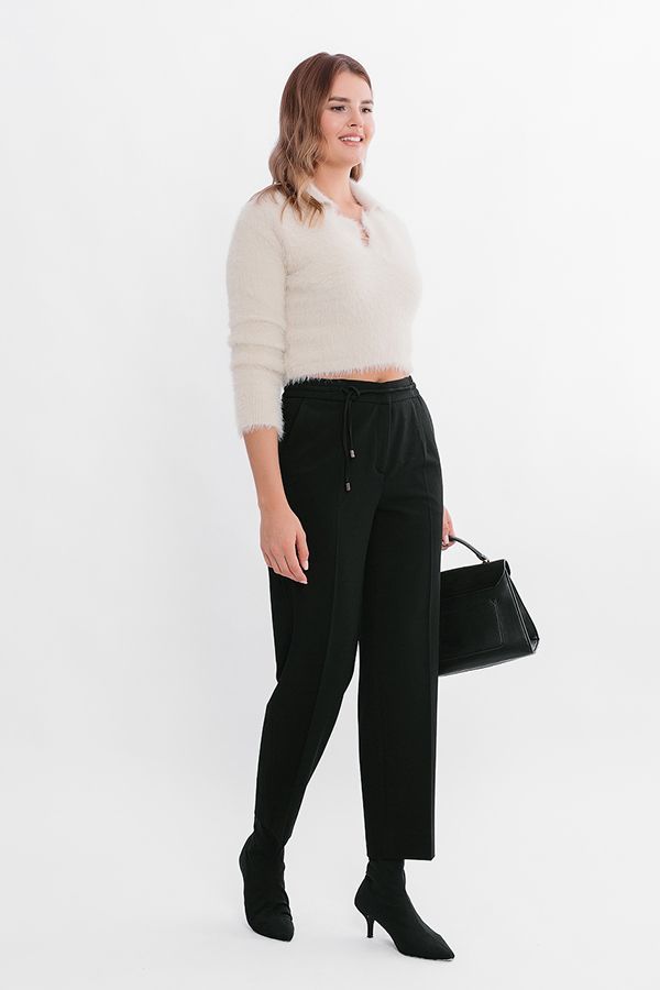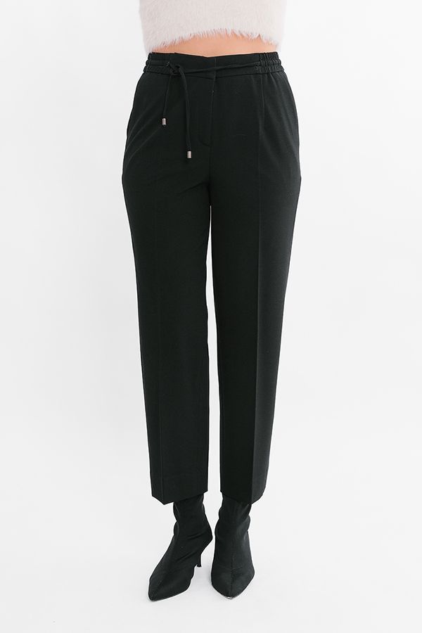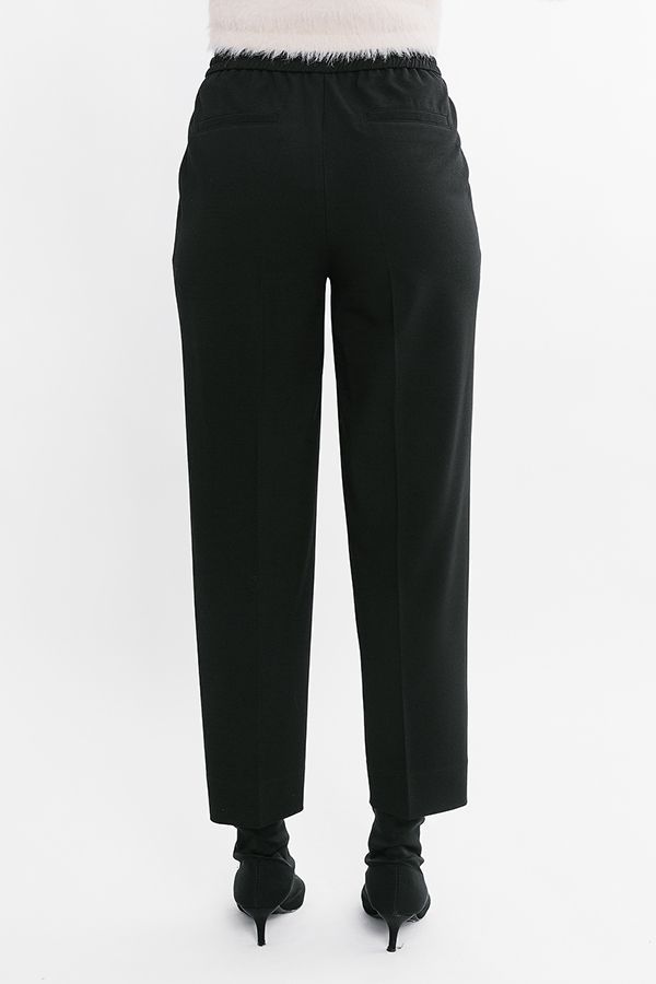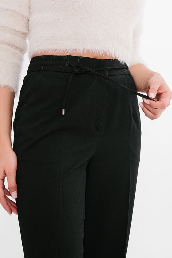 Классическая модель брюк со стрелками. Детали: брюки с высокой посадкой, двойная застежка на крючки и потайную пуговицу, молния. Вытачки, боковые карманы. Сзади имитация карманов. В поясе резина на сборке, кулиска.