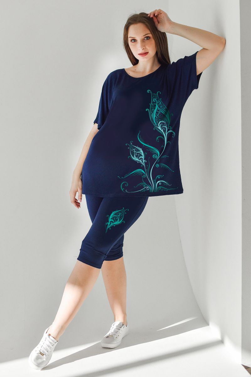 Футболка свободного силуэта из гладкокрашеного полотна (вискоза) с коротким цельнокроеным рукавом. Круглая горловина окантована бейкой из основного полотна. На полочке тематический принт. Низ изделия прямой, обработан швом «в подгибку».