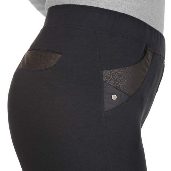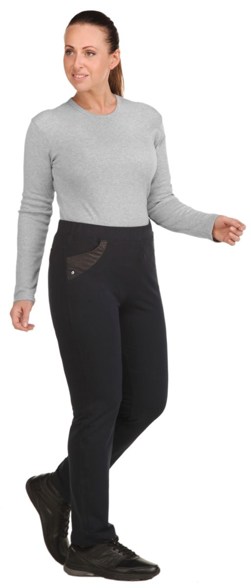 Трикотажные брюки с поясом на резинке. Пояс фиксируется шнурком, вставленным внутрь. Посадка высокая. Лекало стандартное, брючины немного заужены книзу. Передние и задний карманы открытые, декорированы чёрной плащёвкой embo с растительным орнаментом (полиэфирная ткань с термопечатью), однотонной плащёвкой и хольнитеном со стразом. Две размерные группы.