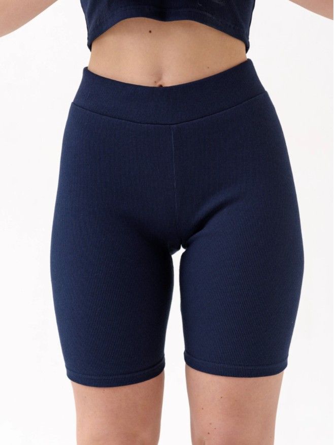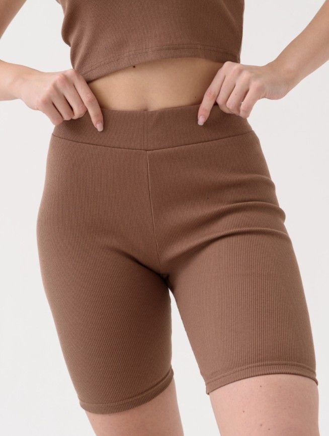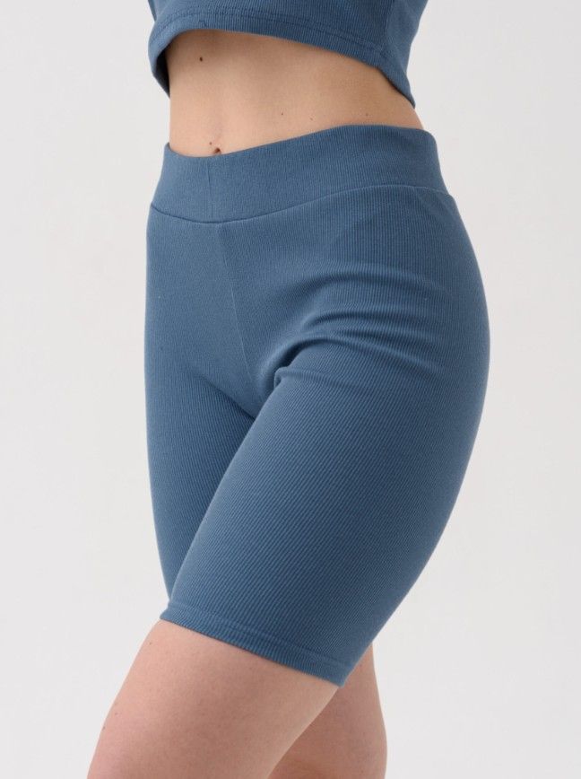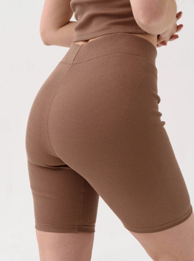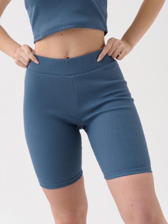 Спортивные женские велосипедки изготовлены из однотонного трикотажного х/б полотна с выработкой «рубчик». Изделие плотного прилегания и высокой посадкой на фигуре, с широким притачным поясом на резинке.
