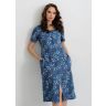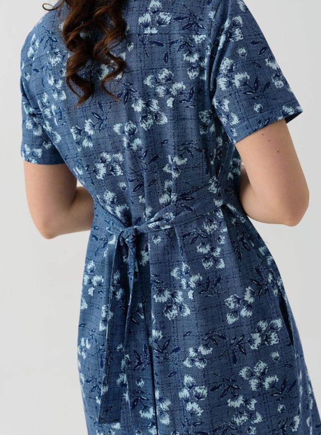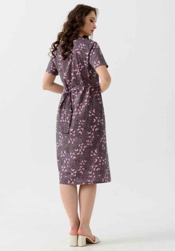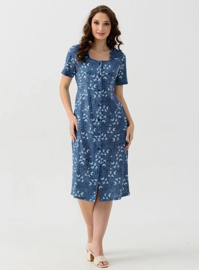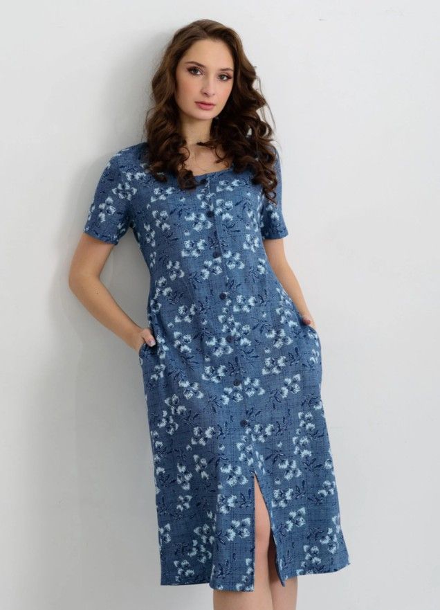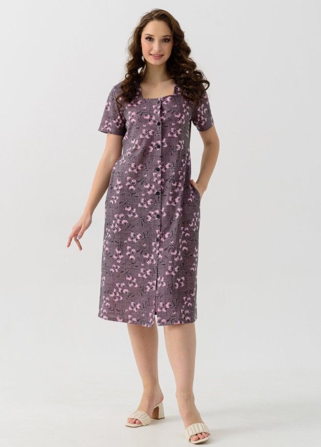 Халат из х/б трикотажного набивного полотна прямого силуэта, с застёжкой на петли – пуговицы, длиной ниже линии колена. Изделие базового покроя с втачными короткими рукавами, карманами с фигурным входом, в боковых швах. Квадратная горловина «каре» на пике моды в этом сезоне.
