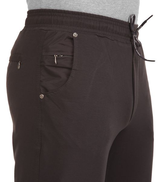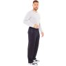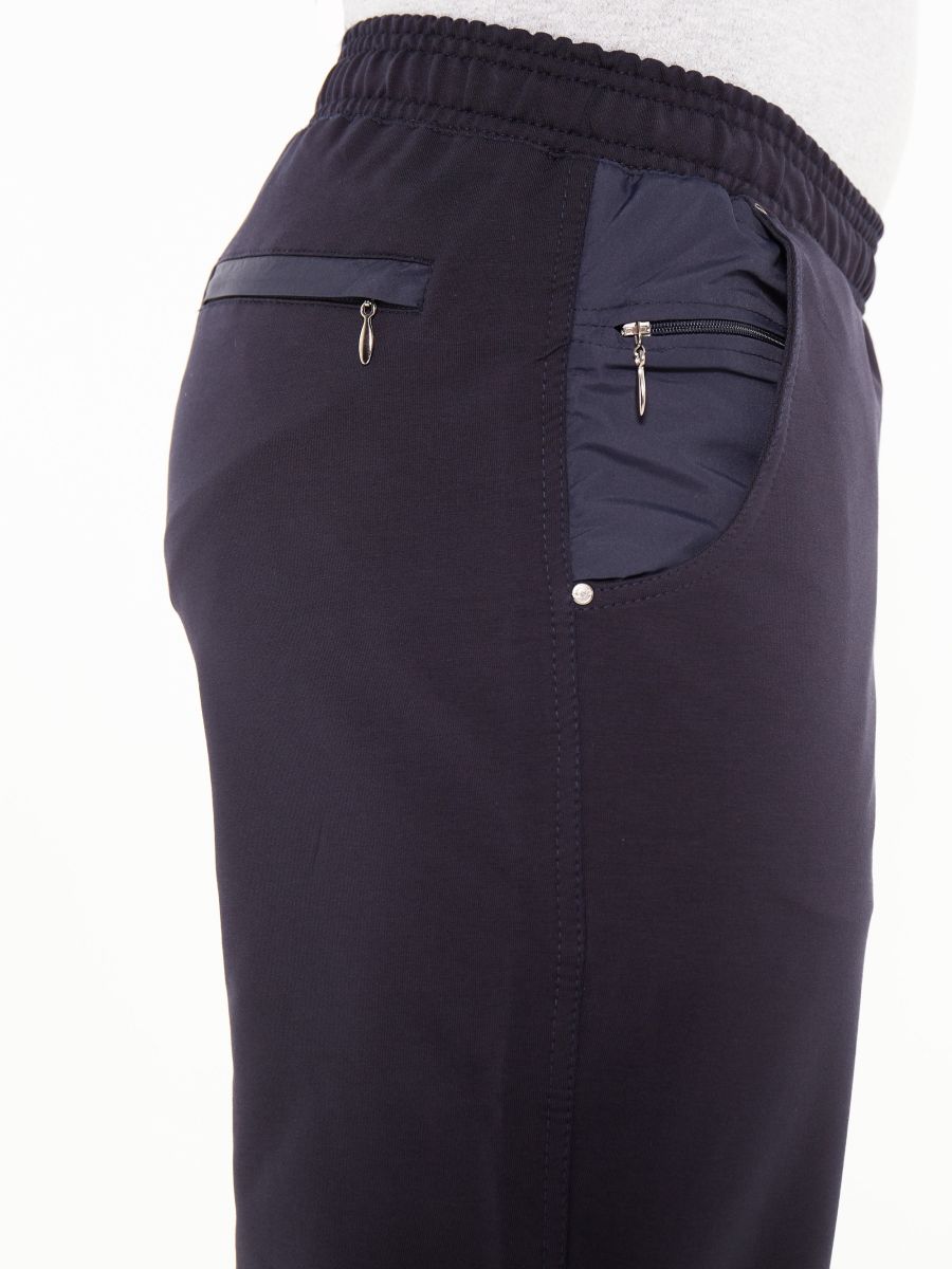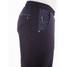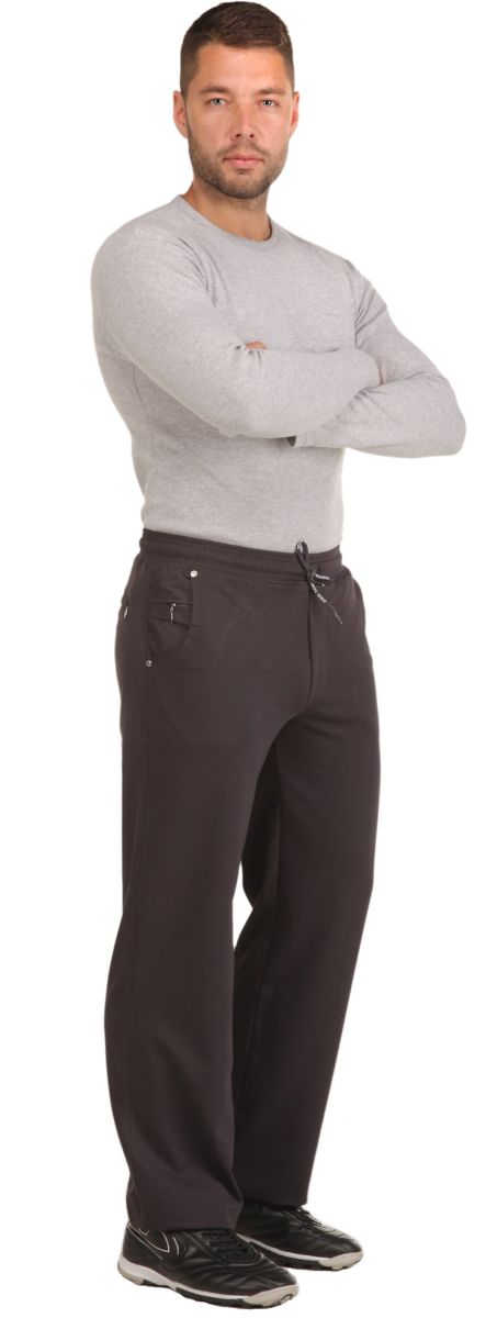 Спортивные брюки на резинке. Пояс фиксируется шнурком с наименованием торговой марки. Брючины прямые. Имитация гульфика. Передние карманы полукруглые открытые, усилены хольнитенами. Часовой и задний карманы на молниях. Передние карманы и листочка заднего отделаны однотонной плащёвкой.
