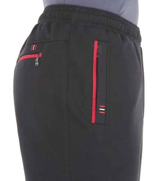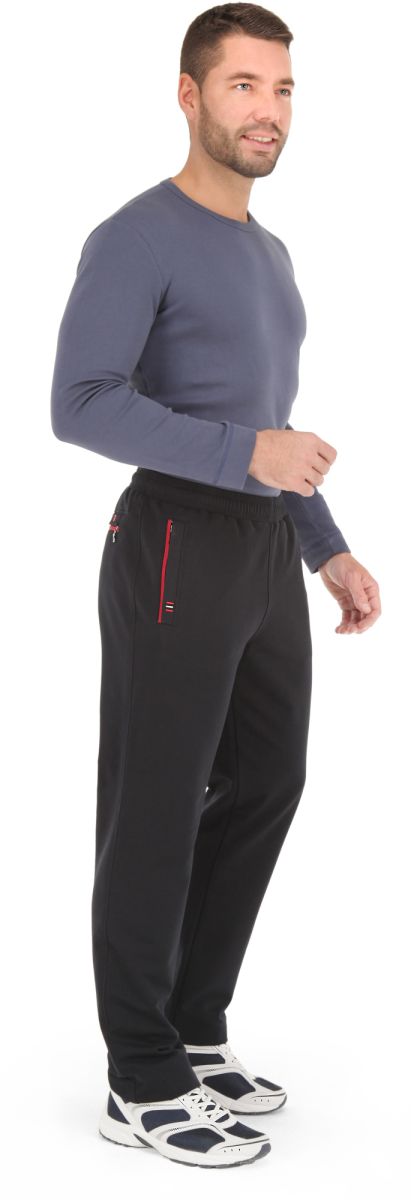 Спортивные трикотажные брюки с поясом на резинке. Для дополнительной фиксации в пояс с внутренней стороны вставлен шнурок. Брючины заужены книзу. Передние карманы вертикальные на молниях под листочками. Вход в карман отделан плащёвкой в цвете гранат. Листочки декорированы цветными закрепками (гранат/светло-серый). Горизонтальный задний карман под кокеткой выполнен аналогично передним. Два размерных ряда.