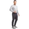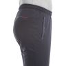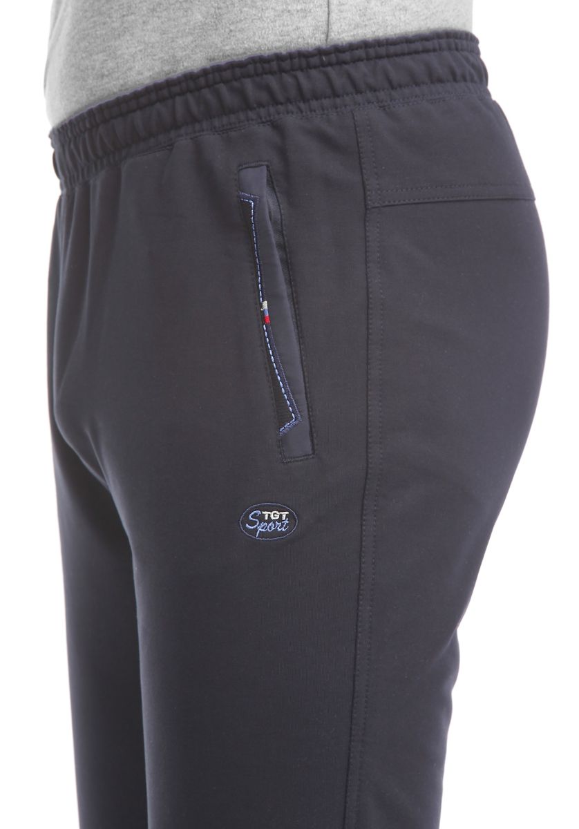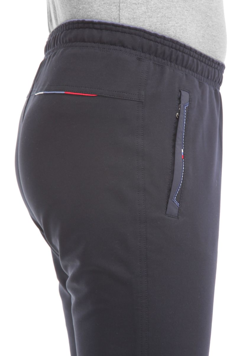Пояс 2-х цветный: внутренняя сторона выполнена из кулирки гранатового цвета. Для дополнительной фиксации в пояс с внутренней стороны вставлен шнурок. Брючины заужены книзу и заканчиваются манжетами. Передние карманы на молниях под листочками, выполненными из кашкорсе и декорированными плащёвкой в тон основного материала, цветными строчками и закрепками. Сзади кокетка, с правой стороны под которую вшиты отрезки кантов в цвета отделки. Под левым карманом - вышивка в фирменном стиле.