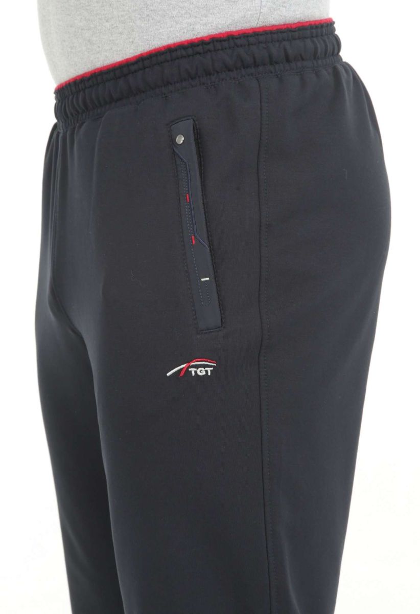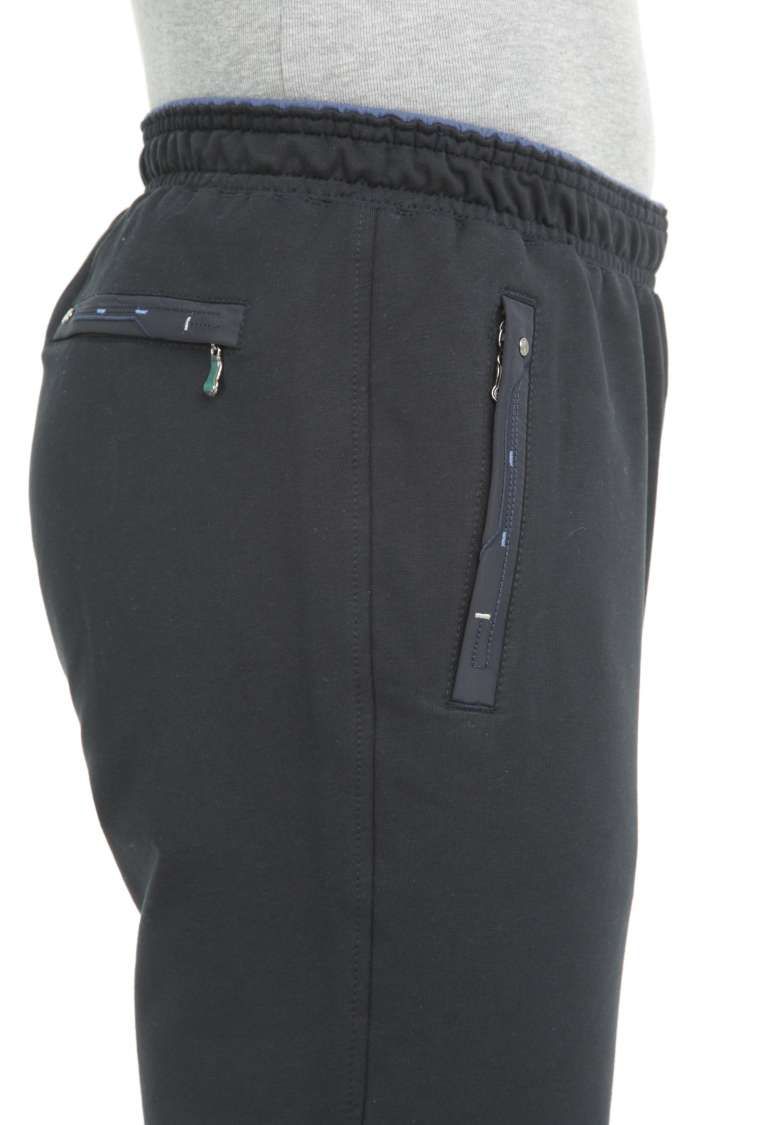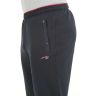 Трикотажные брюки с 2-х цветным поясом на резинке. Для дополнительной фиксации в пояс с внутренней стороны вставлен шнурок. Брючины заужены книзу. Передние карманы на молниях под листочками, отделанными плащёвкой в тон основного материала, декорированы цветными вышивками и хольнитенами. Под левым карманом вышивка в фирменном стиле. Задний карман на молнии под листочкой. Дизайн отделки аналогичен оформлению передних карманов.