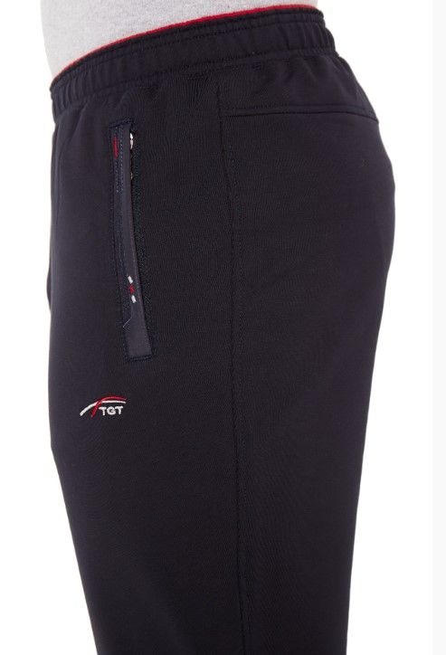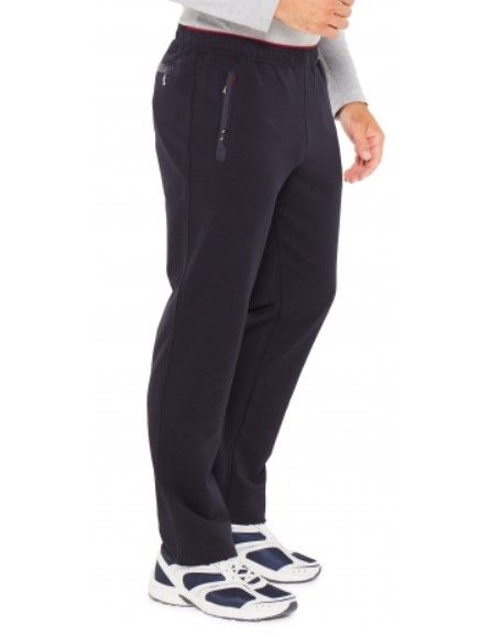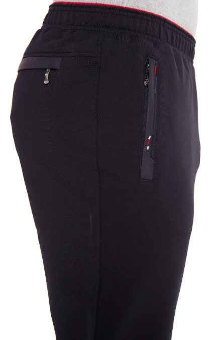 Трикотажные брюки с поясом на резинке. Для дополнительной фиксации в пояс с внутренней стороны вставлен шнурок. Брючины заужены книзу. Передние карманы на молниях под листочками, декрированными элентами из плащёвки в тон основного материала и цветными вышивками. Под левым карманом вышивка в фирменном стиле. Ниже кокетки расположен задний карман на молнии под листочкой.