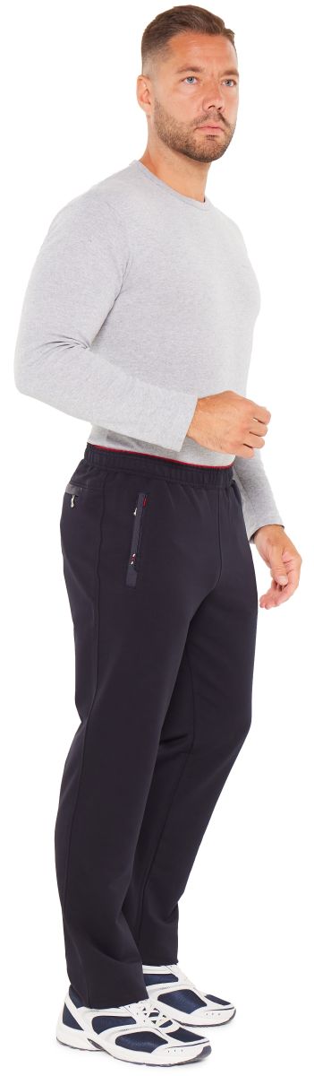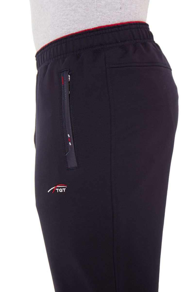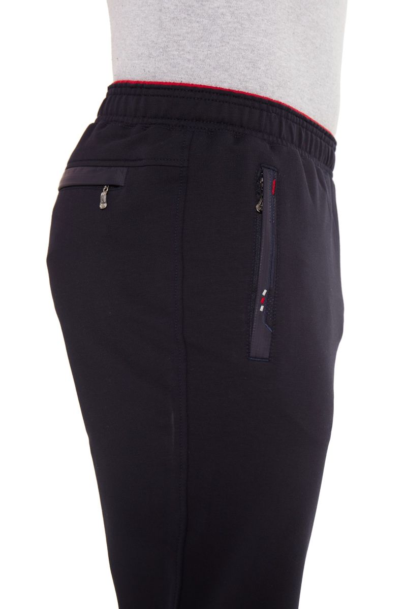 Трикотажные брюки с поясом на резинке. Для дополнительной фиксации в пояс с внутренней стороны вставлен шнурок. Брючины заужены книзу. Передние карманы на молниях под листочками, декрированными элентами из плащёвки в тон основного материала и цветными вышивками. Под левым карманом вышивка в фирменном стиле. Ниже кокетки расположен задний карман на молнии под листочкой.