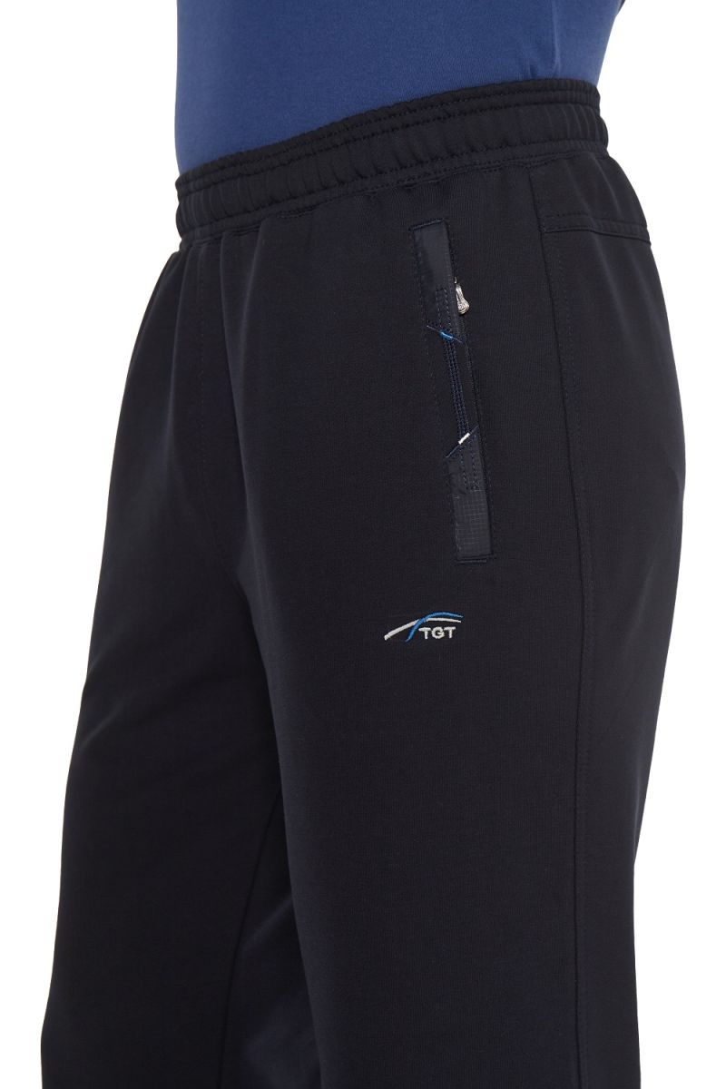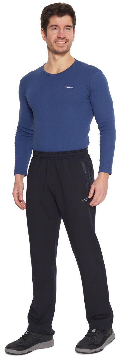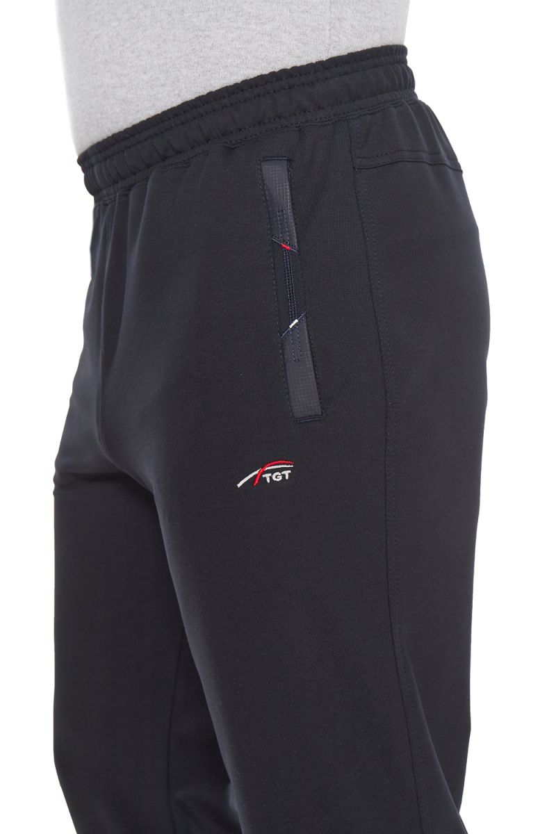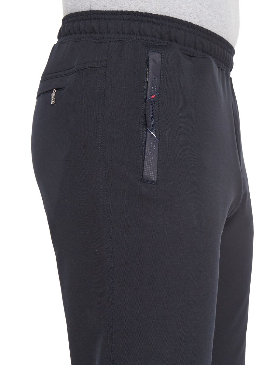 Трикотажные брюки с поясом на резинке. Для дополнительной фиксации в пояс с внутренней стороны вставлен шнурок. Брючины заужены книзу и заканчиваются манжетами. Передние карманы фиксируются прорезиненными молниями с принтом и логотипом торговой марки. Сзади кокетка.