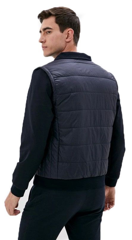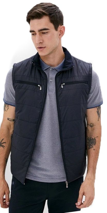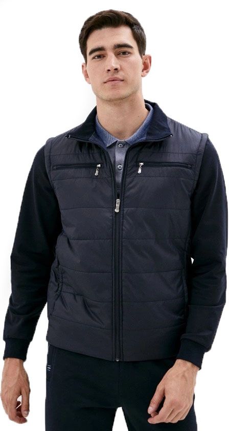 Рукава выполнены из трикотажа с манжетами из риббаны в цвет основного материала и соединены с проймами разъёмными молниями, которые легко отстёгиваются, и толстовка становится жилетом из простёганной 100 граммовым синтепоном плащёвки. Горизонтально расположены два нагрудных, врезных кармана на молниях, и выделены отстрочкой два вертикальных боковых кармана.