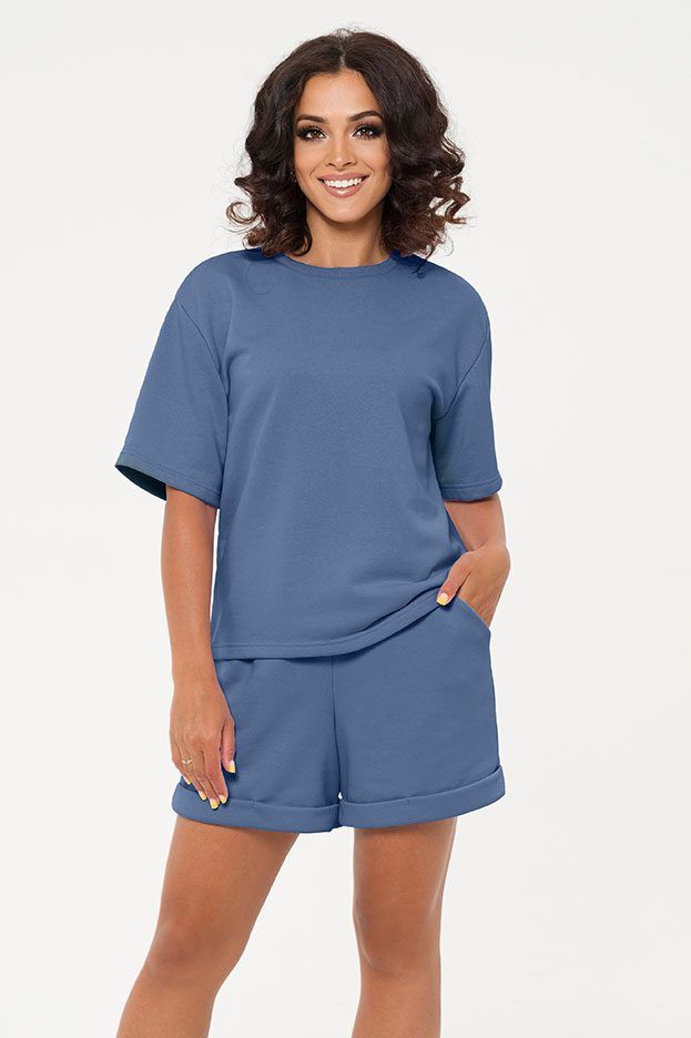Костюм- футболка с шортами свободного силуэта из хлопкового футера 3-х нитки. Футболка свободная со спущенным рукавом. Свободные шорты с боковыми карманами, притачной пояс с резинкой.