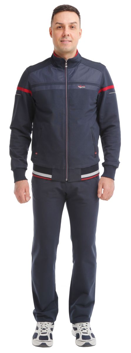Толстовка с поясом и из 3-х цветной рибаны. Молния в борт декорирована цветными нитками (светло-серая/гранат или светло-серая/парламент). Грудь отделана плащёвкой в цвет основного материала. Вставки на вороте и рукавах выполнены из цветного трикотажа (парламент или гранат). Передние карманы на молниях под листочками, отстроченными нитками в тон основного материала и украшенными цветными закрепками. На левой стороны груди 2-х цветная вышивка в фирменном стиле. Брюки с поясом на резинке. Брючины заужены к низу. С внутренней стороны пояс фиксируется шнурком. Карманы на молниях под листочками из трикотажа в тон основного материала. Сзади кокетка. Две размерные группы.