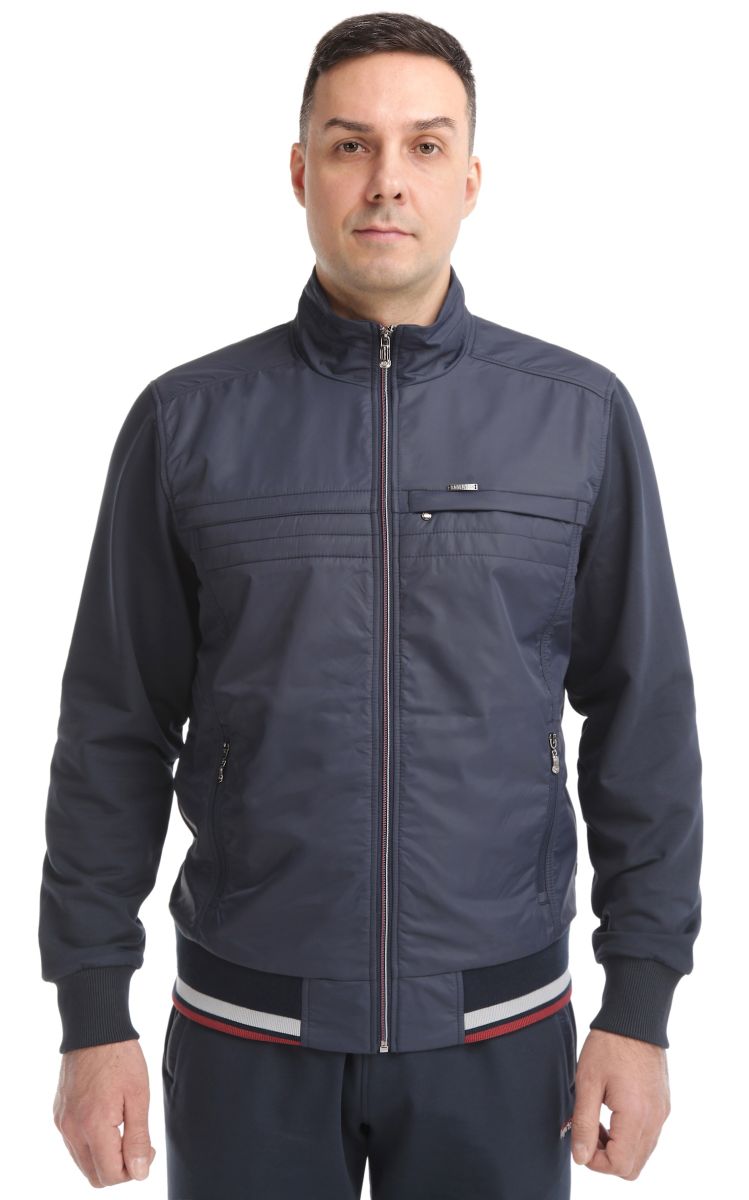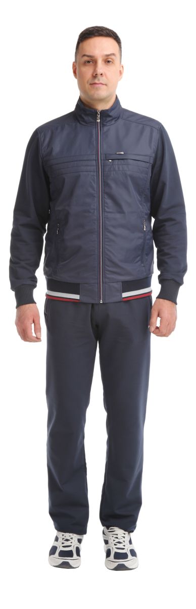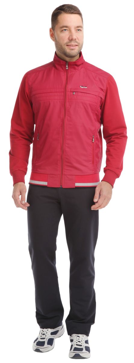Толстовка с поясом и из 3-х цветной рибаны. Молния в борт декорирована цветными нитками (светло-серая/гранат или светло-серая/парламент). Вся передняя часть толстовки, ворот и задняя кокетка отделана плащёвкой в цвет основного материала. В горизонтальный рельеф на груди встроена листочка, закрывающая вход в карман, фиксируемый молнией. Над листочкой пришит металлический шилдик с наименованием торговой марки. Вдоль вертикальных боковых рельефов расположены передние карманы на полупотайных молниях. Брюки с поясом на резинке. Брючины заужены к низу. С внутренней стороны пояс фиксируется шнурком. Карманы на молниях под листочками из трикотажа в тон основного материала. Под левым карманом 2-х цветная вышивка в фирменном стиле. Сзади кокетка. Две размерные группы.