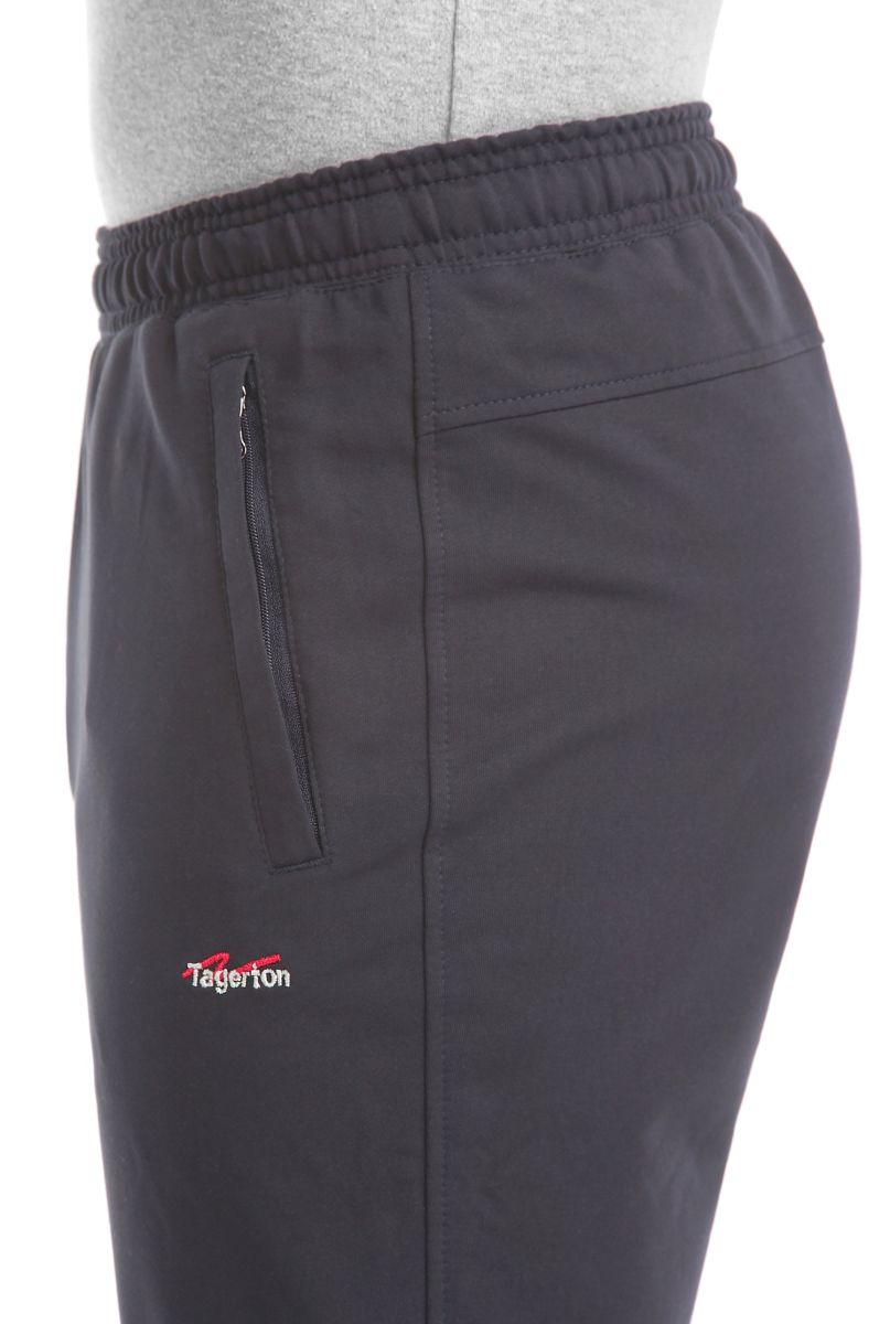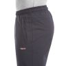 Брюки с поясом на резинке. Брючины заужены к низу. С внутренней стороны пояс фиксируется шнурком. Карманы на молниях под листочками из трикотажа в тон основного материала. По нижним углам листочек настрочены декоративные элементы из цветной плащёвки. Под левым карманом 2-х цветная вышивка в фирменном стиле. Сзади кокетка.