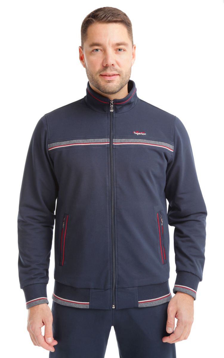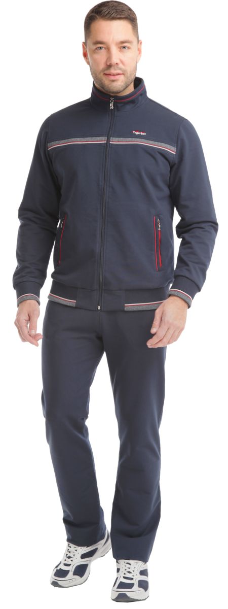 Толстовка. Основная идея дизайна – использование 4-х цветной рибаны в качестве материала для пояса и манжет, а также отделки верхней части груди. Реализованы два варианта цветовых решений: тёмно-синий/тёмно-синий меланж/светло-серый/гранат и тёмно-синий/тёмно-синий меланж/светло-серый/парламент. Передние карманы на молниях, частично прикрытых узкими листочками, фиксируются молниями в цвет отделки. Наружная сторона ворота и листочки карманов отделаны цветным кантом (гранат или парламент). На левой стороны груди 2-х цветная вышивка в фирменном стиле.
