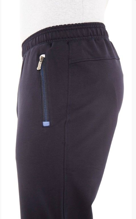 Толстовка с поясом и из 4-х цветной рибаны. Молния в борт декорирована цветными нитками (светло-серая/гранат или светло-серая/парламент). Верхняя часть груди, плечи и кокетка отделаны плащёвкой в тон основного материала. На левой стороне груди расположен горизонтальный карман, фиксируемый молнией. В рельефы ворота и плеч вставлены цветные канты. Передние карманы на молниях под листочками. Листочки всех карманов обшиты плащёвкой и украшены цветными вышивками. Брюки с поясом на резинке. Брючины заужены к низу. С внутренней стороны пояс фиксируется шнурком. Карманы на молниях под листочками из трикотажа в тон основного материала. Сзади кокетка.