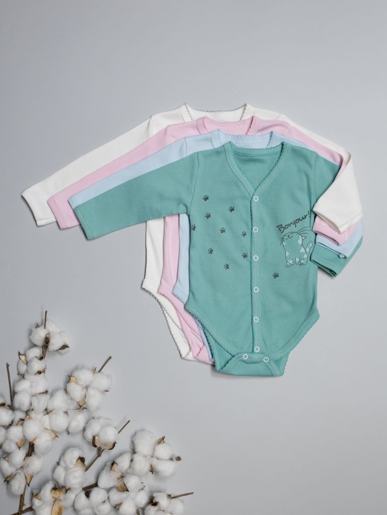 Боди с длинными рукавами на манжетах и воротником стойкой. Р56-74