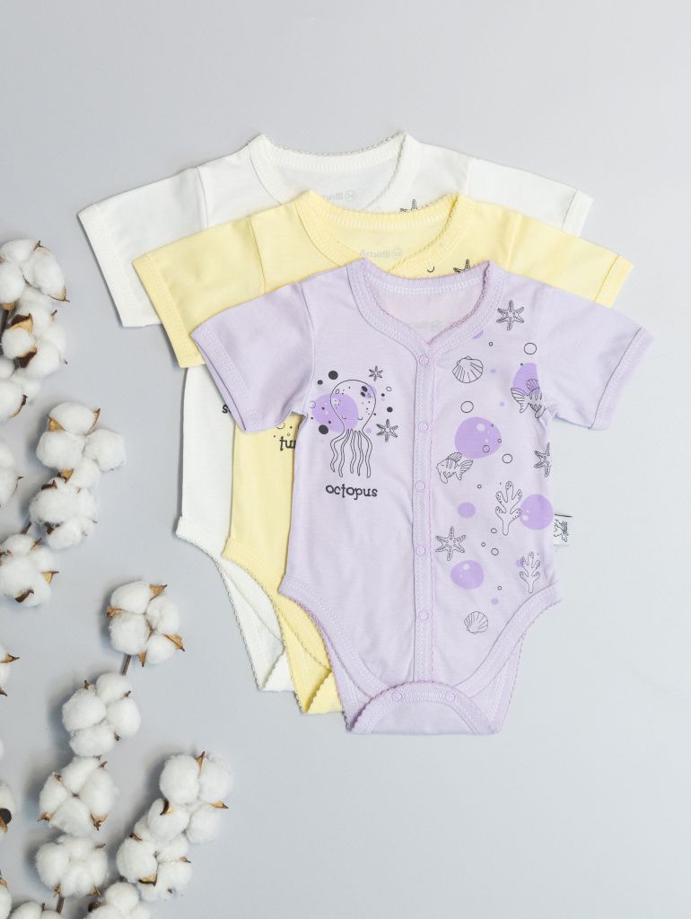Боди (полукомбинезон) с короткими рукавами и вертикальной застежкой по центру полочки. Все срезы обработаны бейкой и мережкой.