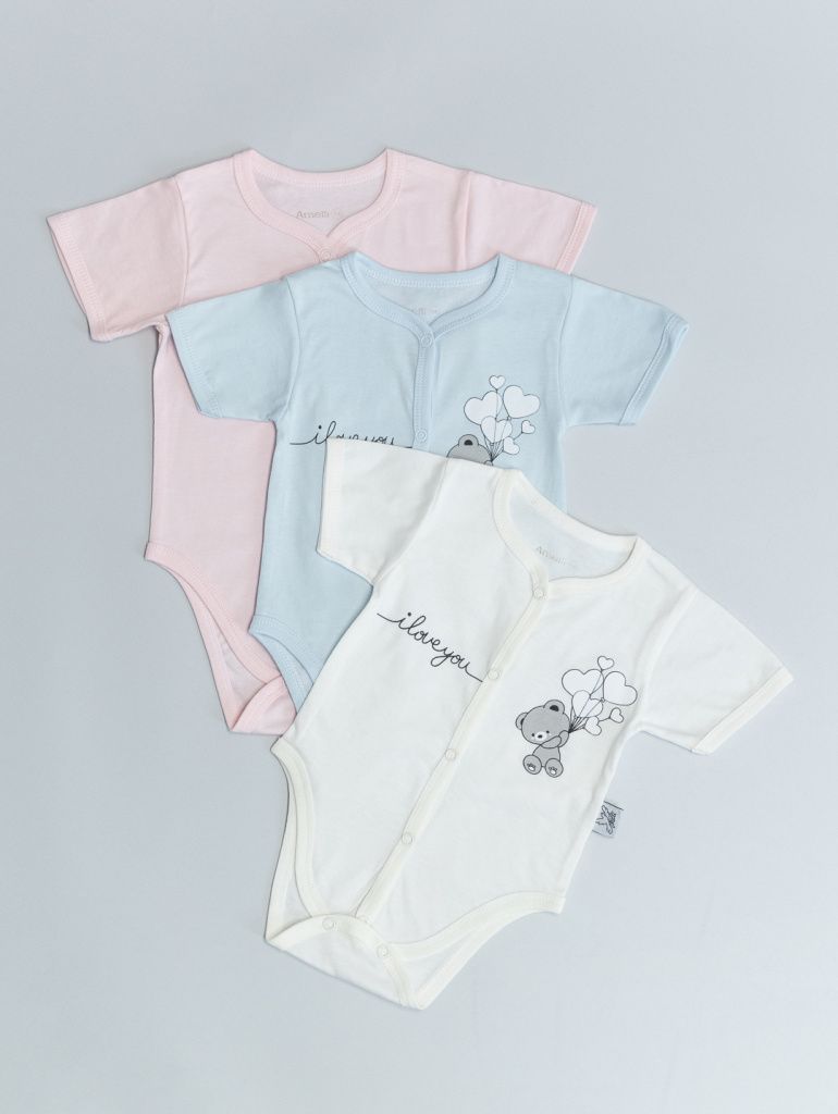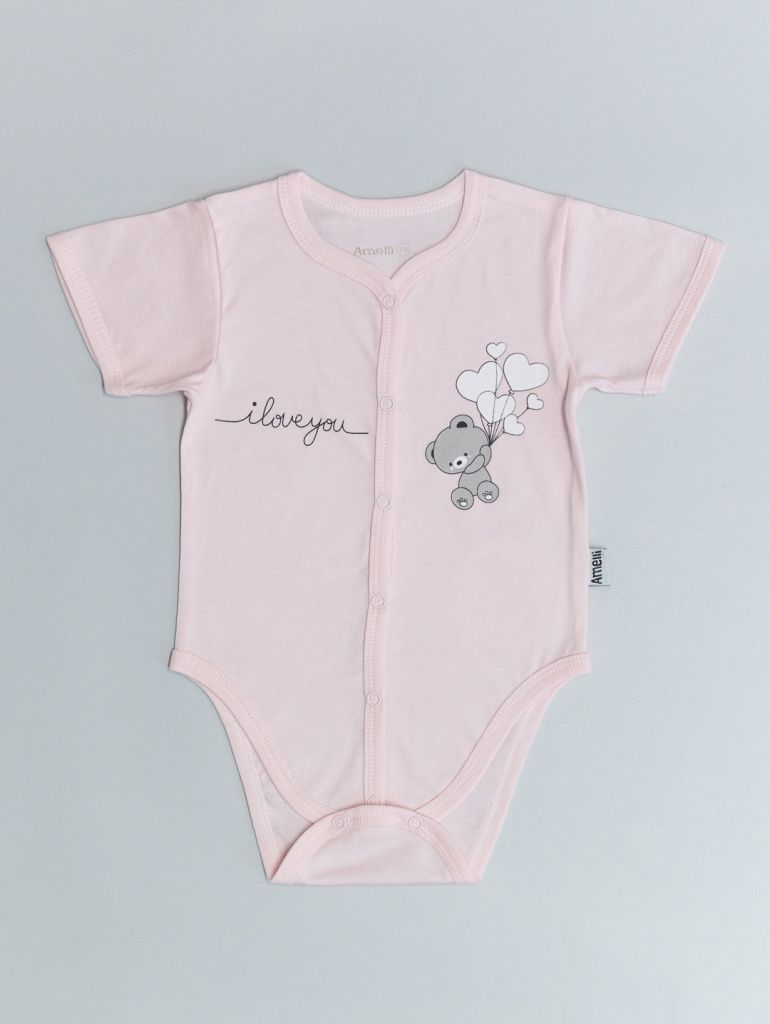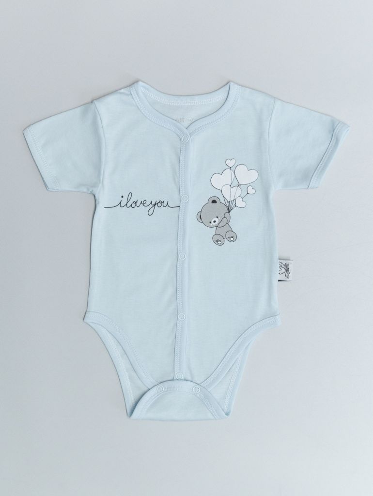 Боди 56-80 (полукомбинезон) с короткими рукавами и вертикальной застежкой по центру полочки. Все срезы обработаны бейкой и мережкой.