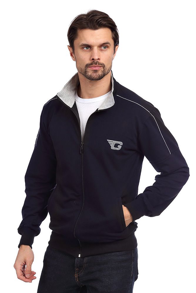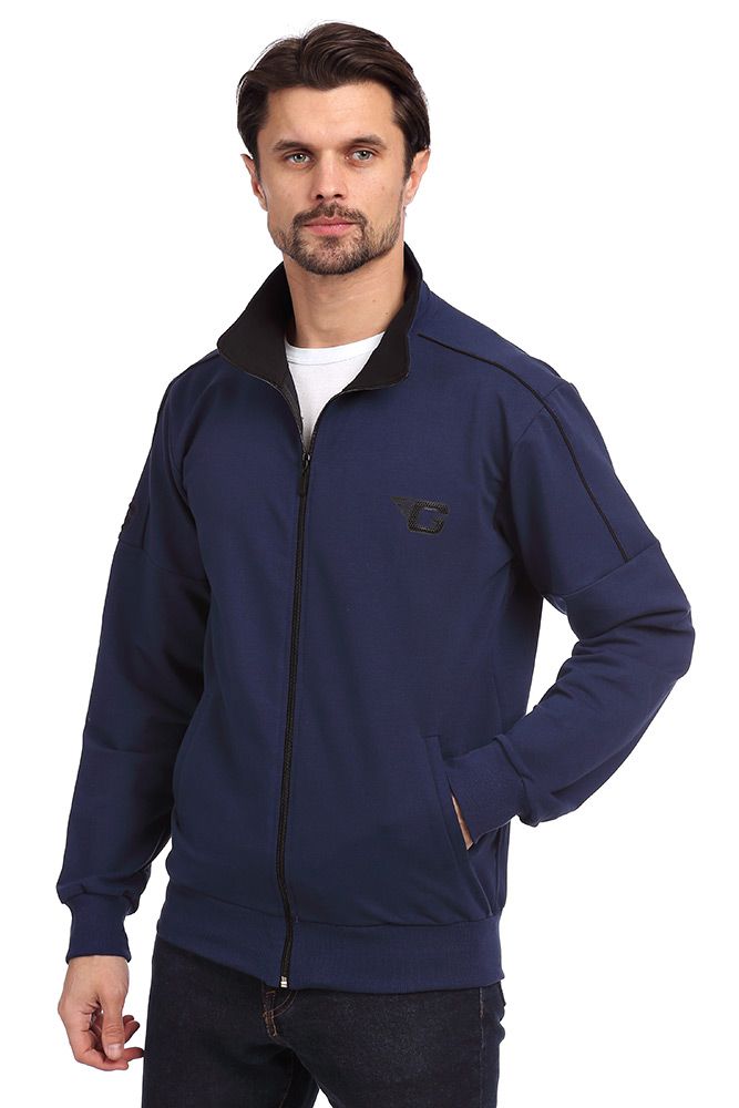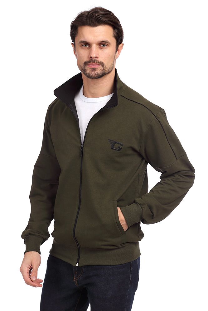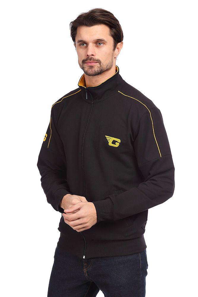 Толстовка на длинной молнии с двумя боковыми карманами. Эффектные детали: воротник-стойка, отделка контрастной тканью с внутренней стороны ворота, сложный отрезной крой рукава с ярким кантом, низ и рукава на резинке (манжет).