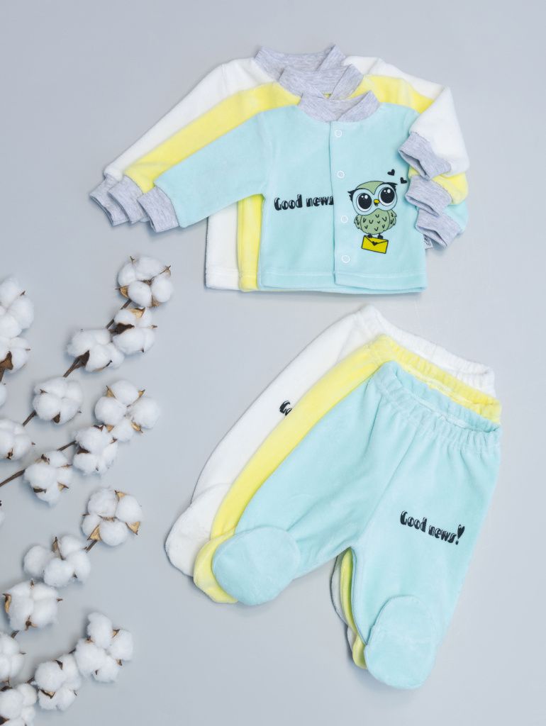 Комплект из кофточки с воротником стойкой и манжетами, ползунков на резинке и сборкой по ножке.