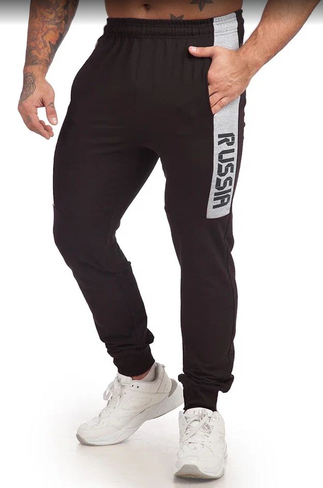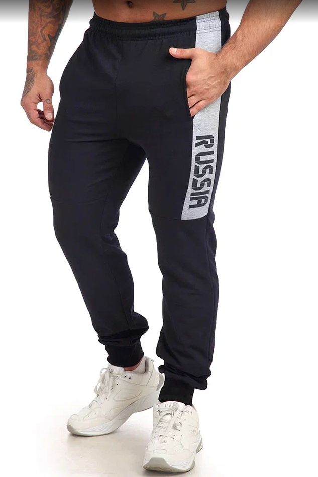 Прямой силуэт, карманы в швах, пояс на внутренней резинке. Сбоку вверху вставки из ткани контрастного цвета, принт. Внизу - резинка (манжет).