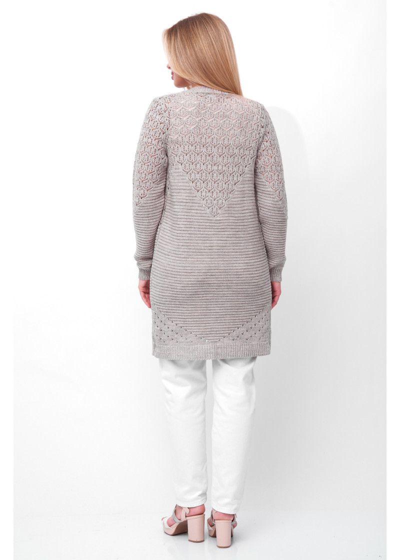Кардиган ажурный полуприлегающего силуэта. Горловина круглая, рукава втачные длинные. Трикотажный кардиган выполнен сочетанием ажурного и рельфного переплетения. Горловина, низ изделия, манжеты и края бортов выполнены эластичным переплетением. В комплект входит крупная декоративная булавка.Декоративные элементы Внимание! Декоративные элементы и фурнитура могут отличаться от заявленного на фото!