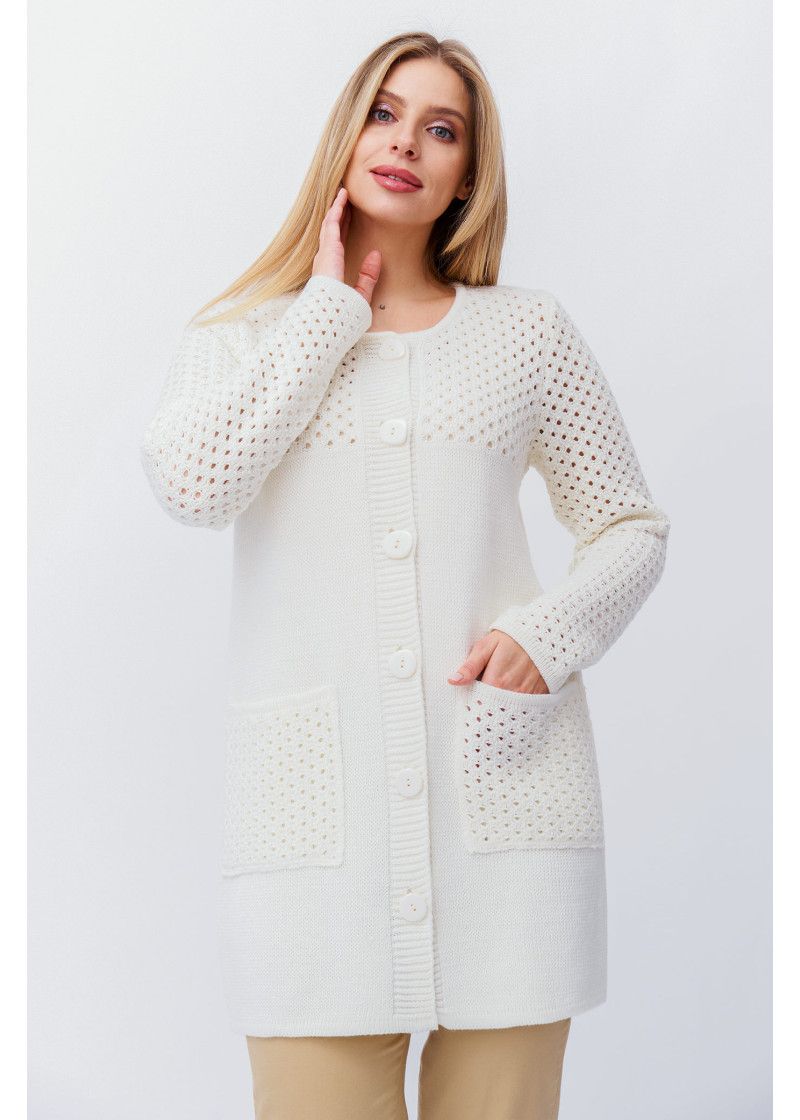 Женский вязаный кардиган с круглой горловиной, на пуговицах. Рукава втачные длинные, накладные карманы. Кокетка, рукава, карманы выполнен ажурным плетением Модель прямого силуэта, длина изделия до колен. Состав изделия включает в себя 50% хлопка, что дает комфорт в носке в любое время года. Модель отлично подойдет к платью, юбке и брюкам в качестве верхней одежды летом и для носки в помещении в прохладное время года. Составит нежный и романтичный образ каждой дамы.