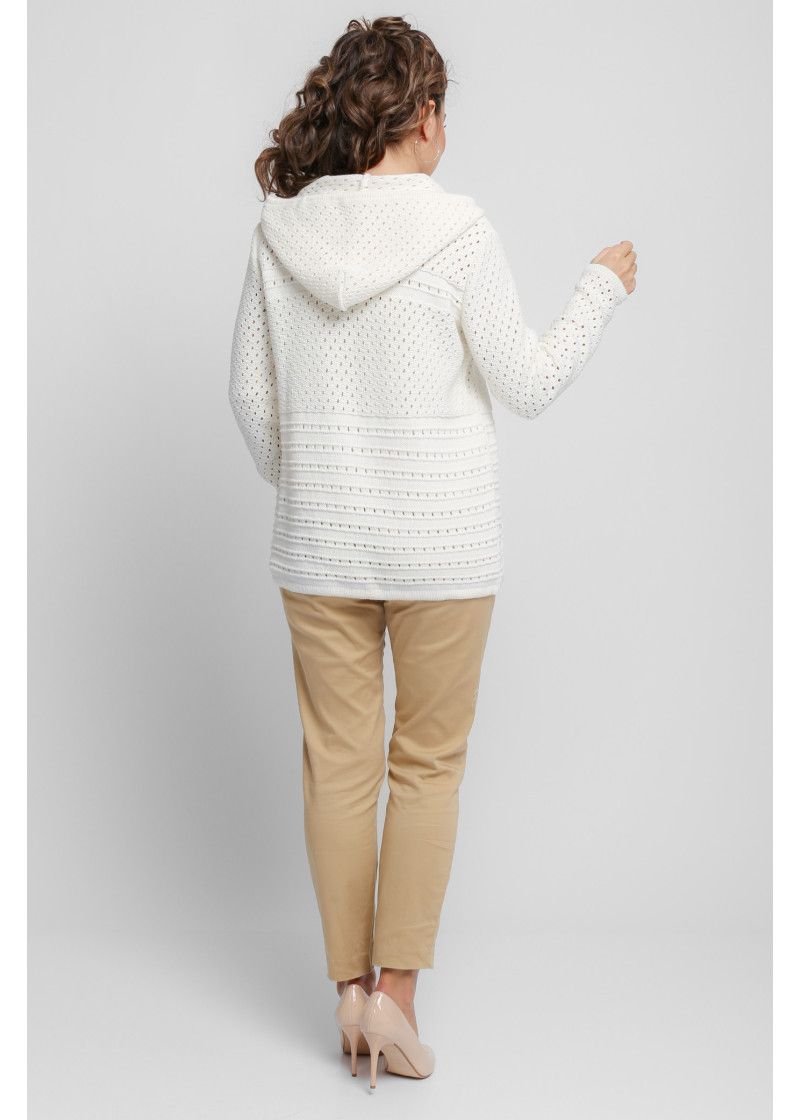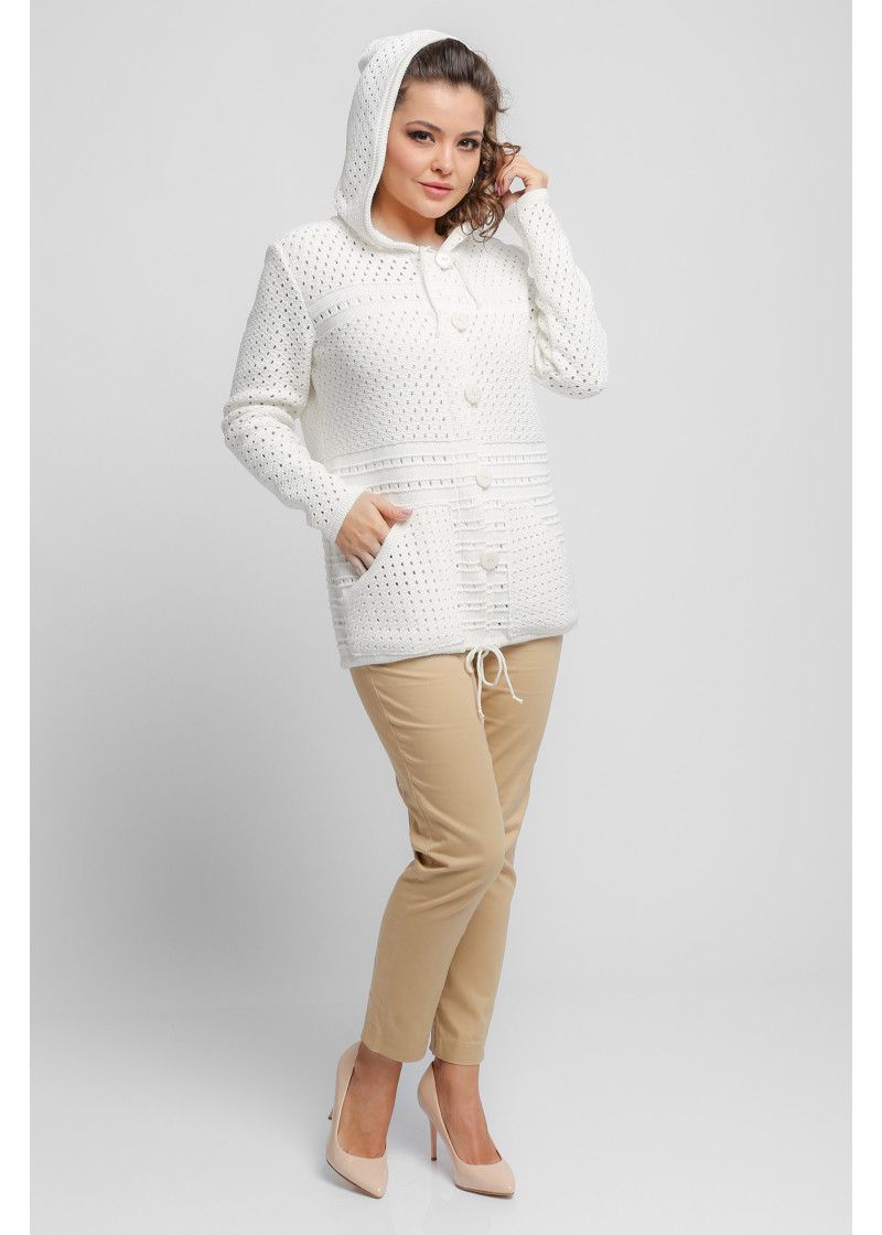 Женский вязаный ажурный жакет с капюшоном, застегивающийся на пуговицы с навесными петлями. Рукава втачные длинные. Два накладных кармана. По низу жакет можно присборить на кулиску, которая позволяет получить мягкий силуэт Изделие изготовлено из качественной пряжи, в составе которой 50% хлопка. Ажурная вязка позволяет чувствовать себя комфортно и свободно. Такой жакет прекрасно подходит активным модницам, которые привыкли много двигаться.