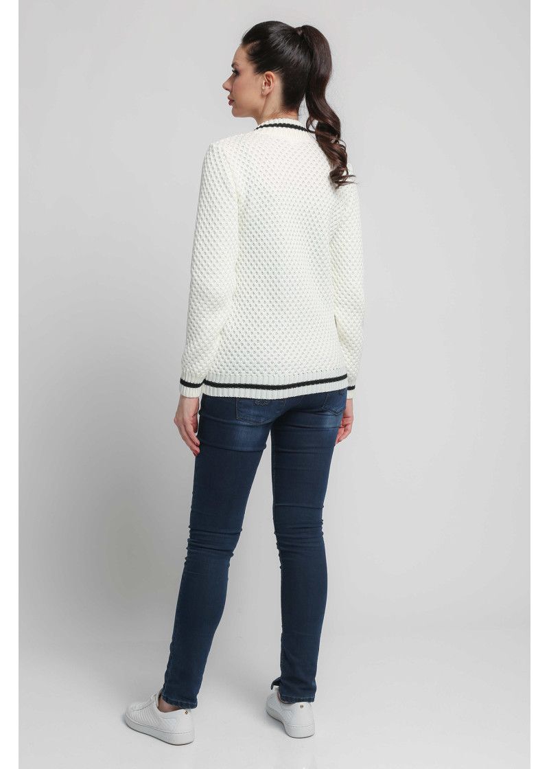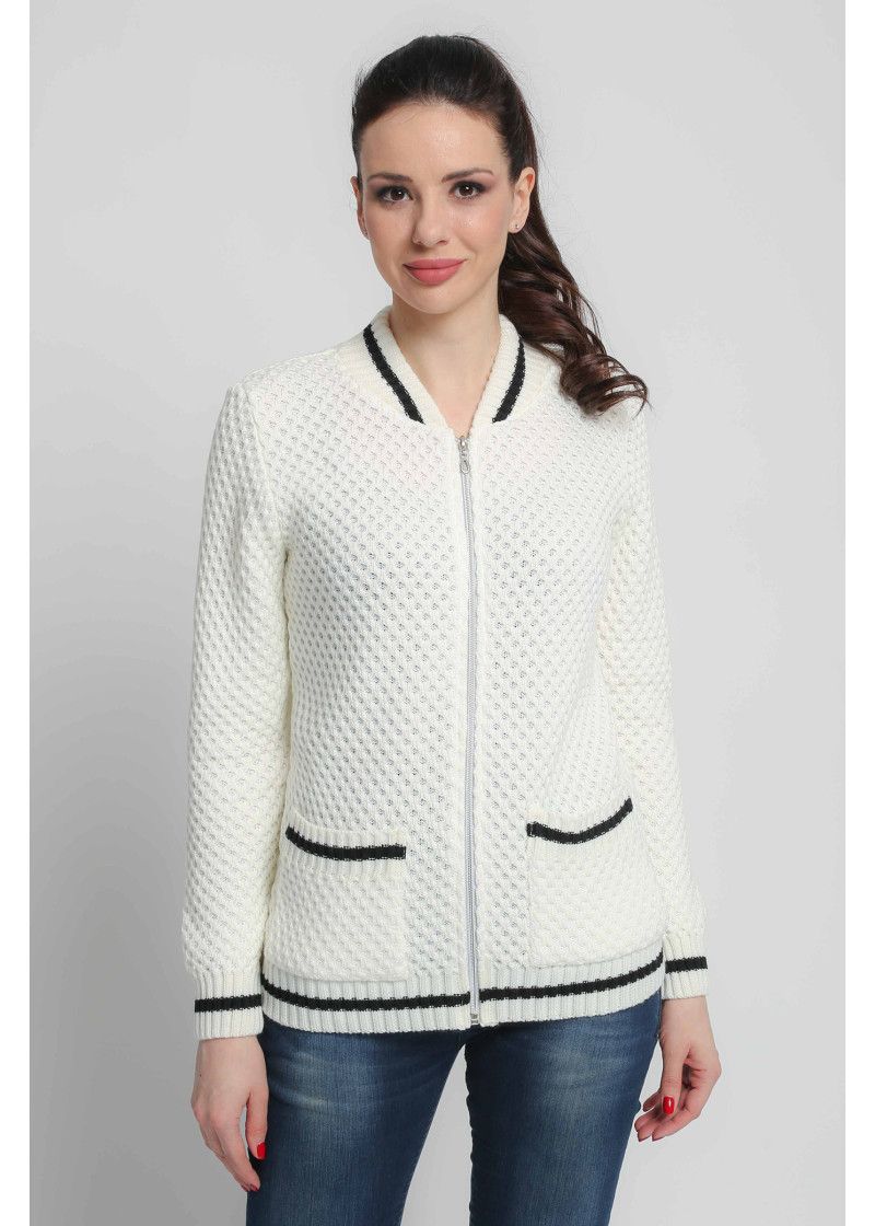 Женский жакет прямого силуэта на молнии, в спортивном стиле. Воротник-полустойка. Рукава втачные длинные. Два накладных кармана. Рисунок вязки создает впечатление объемного рисунка 3D. Контрастная отделка по вороту, манжетам рукавов, карманам и низу изделия.