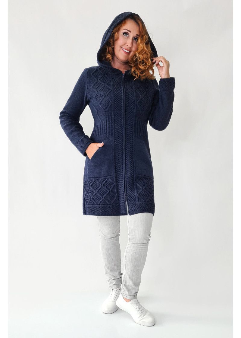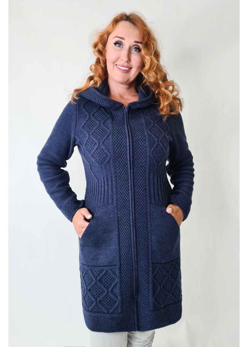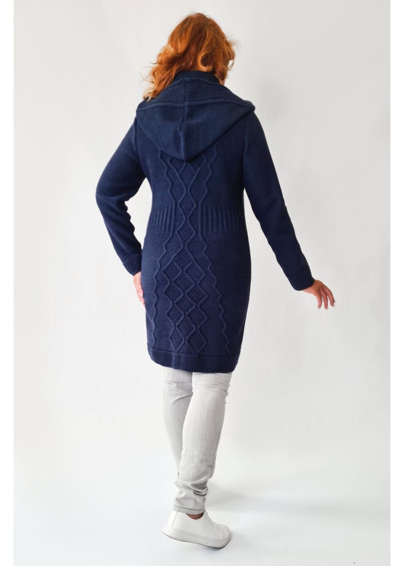 Кардиган женский с капюшоном полуприлегающего силуэта на молнии. Рукава втачные длинные. По бокам вывязаные карманы "кенгуру". Кардиган выполнен рельефным переплетением.