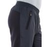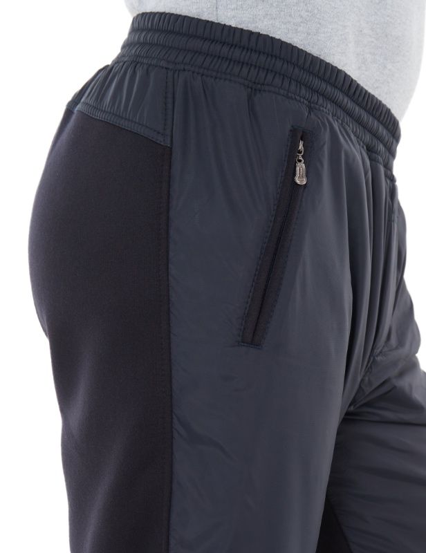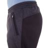 Трикотажные брюки с поясом на резинке. Для дополнительной фиксации в пояс с внутренней стороны вставлен шнурок. Брючины заужены книзу и заканчиваются манжетами. Пояс, задняя кокетка, брючины до колен декорированы нейлон таффетой в тон основного материала. Передние карманы на молниях в рамку.