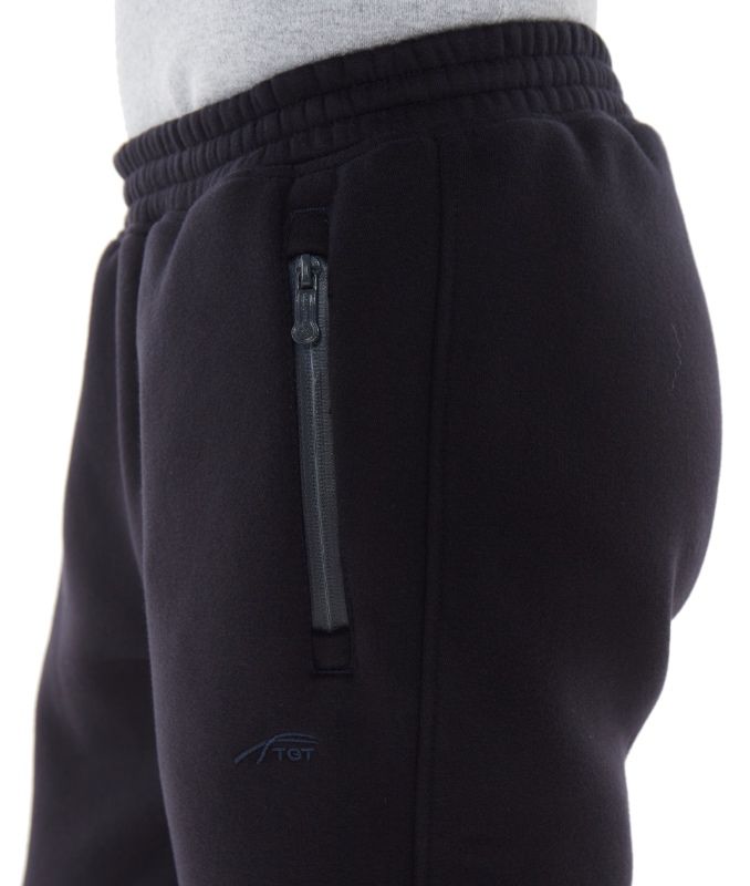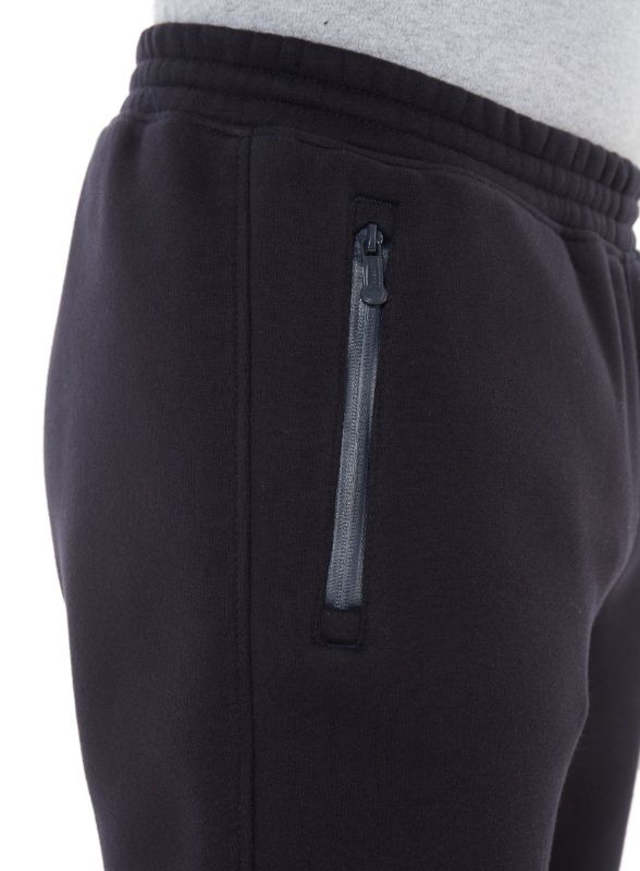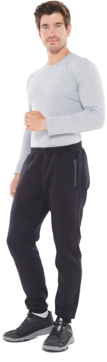 Трикотажные брюки с поясом на резинке. Начёс с внутренней стороны полотна обеспечивает прекрасную защиту от холода, дополнительная обработка наружной поверхности придаёт бархатистость. Для дополнительной фиксации в пояс с внутренней стороны вставлен шнурок. Брючины заужены книзу и заканчиваются манжетами. Передние карманы фиксируются прорезиненными молниями. Под левым карманом вышивка в фирменном стиле в тон основного материала.