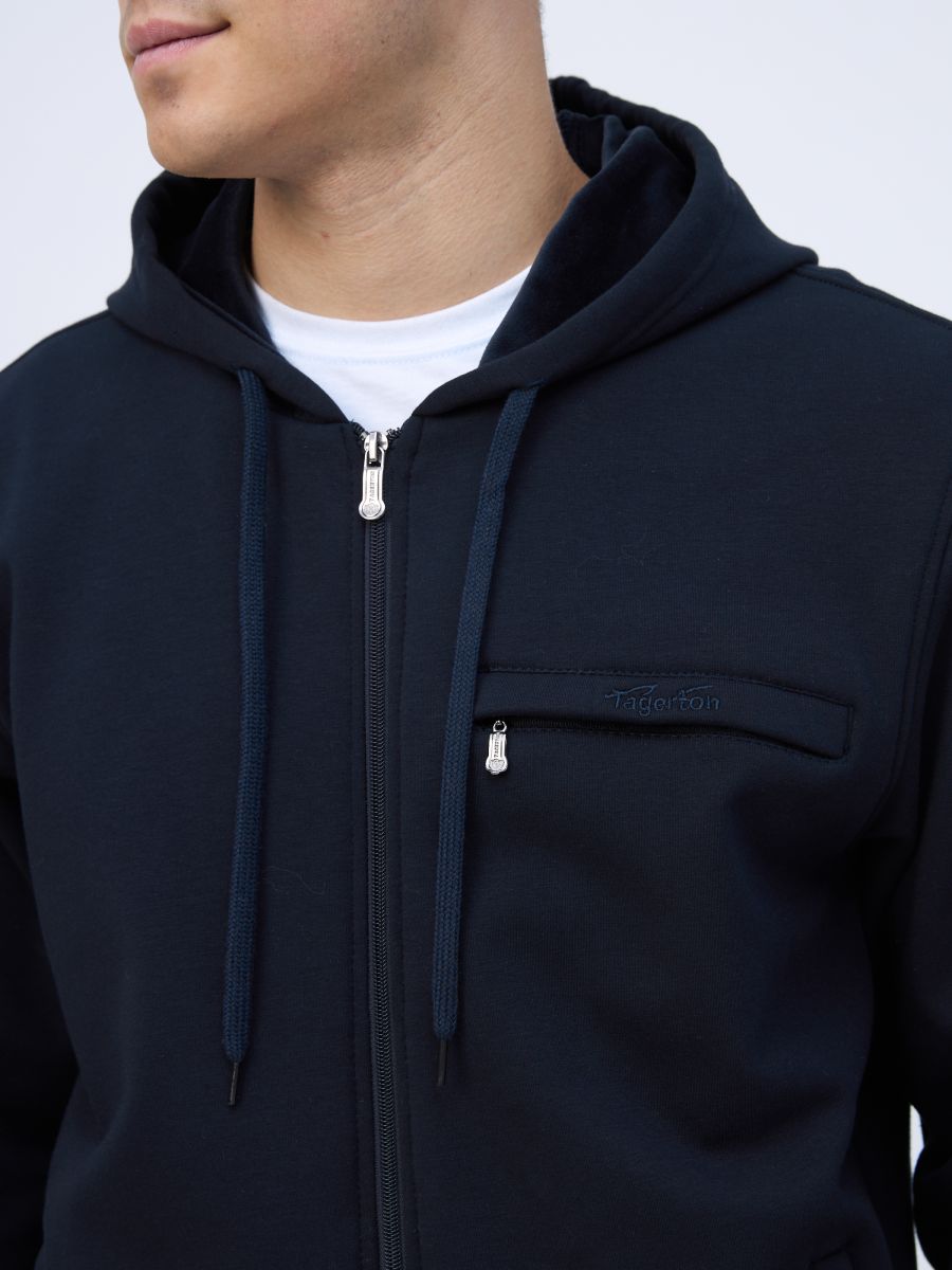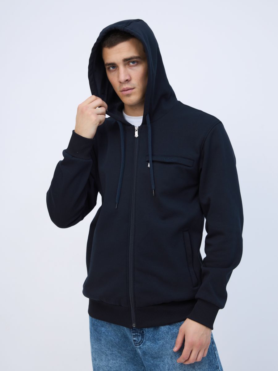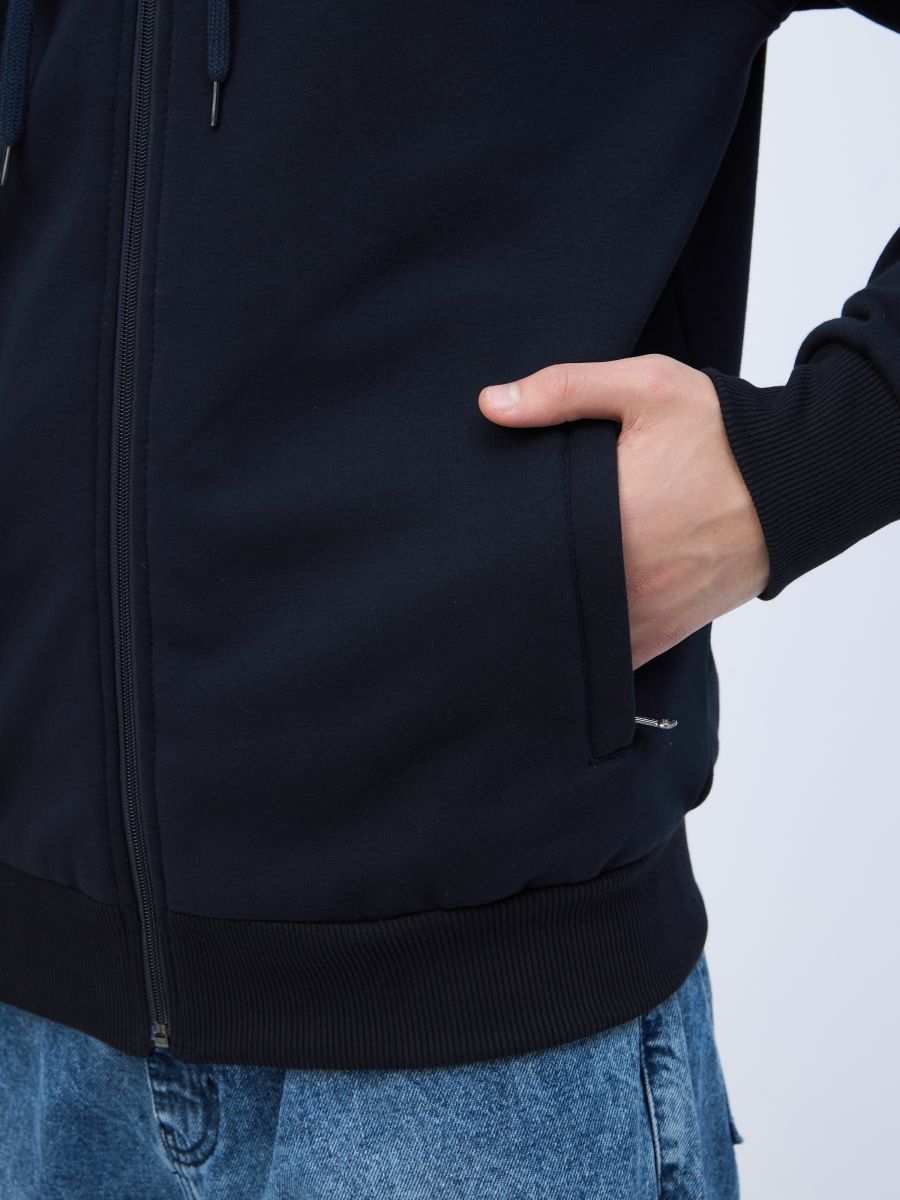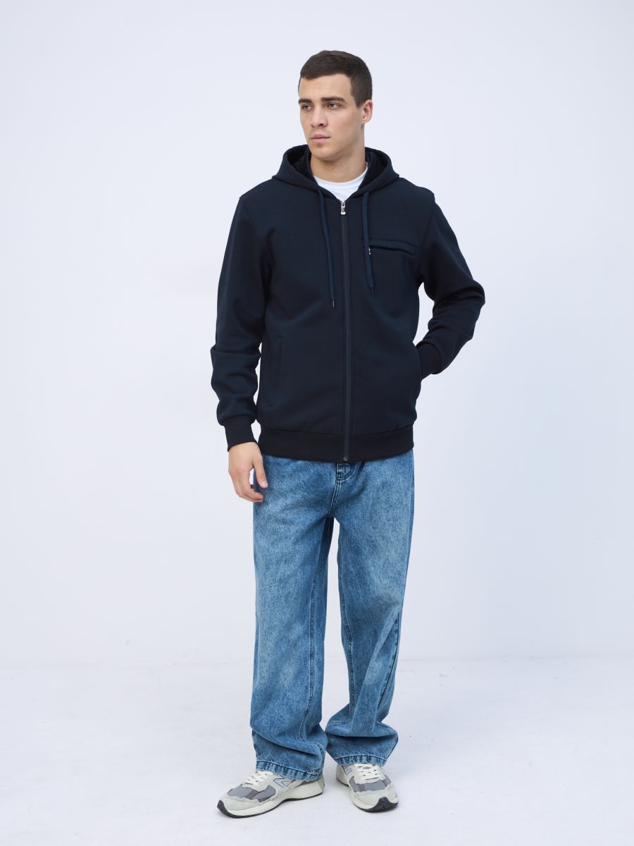 Изделие удобное и практичное. Может использоваться как верхняя одежда в качестве утеплённой ветровки или куртки в межсезонье и нехолодную зиму. Тёмно-синий цвет толстовки выигрышно смотрится с джинсами.
