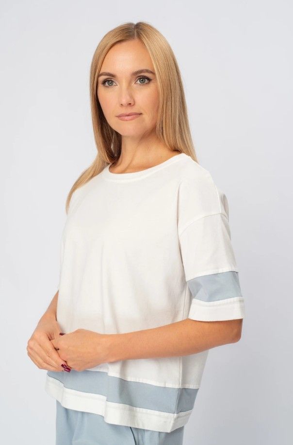Изделия из этой ткани обладают хорошей прочностью, не образуют складок, замечательно держат форму. Костюм свободно сидит на фигуре и не стесняет движение. Данная модель подойдет для занятий спортом, фитнесом.