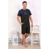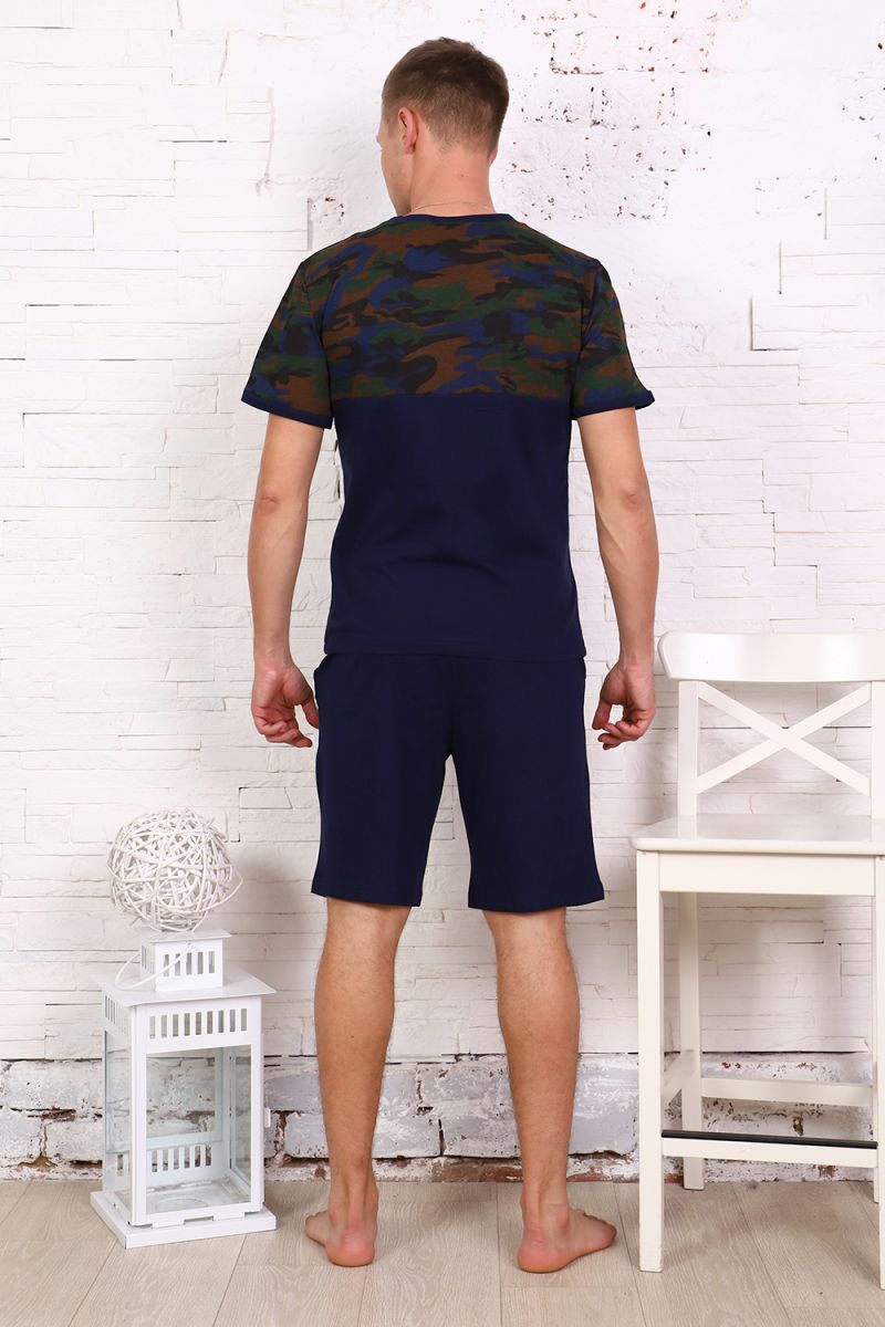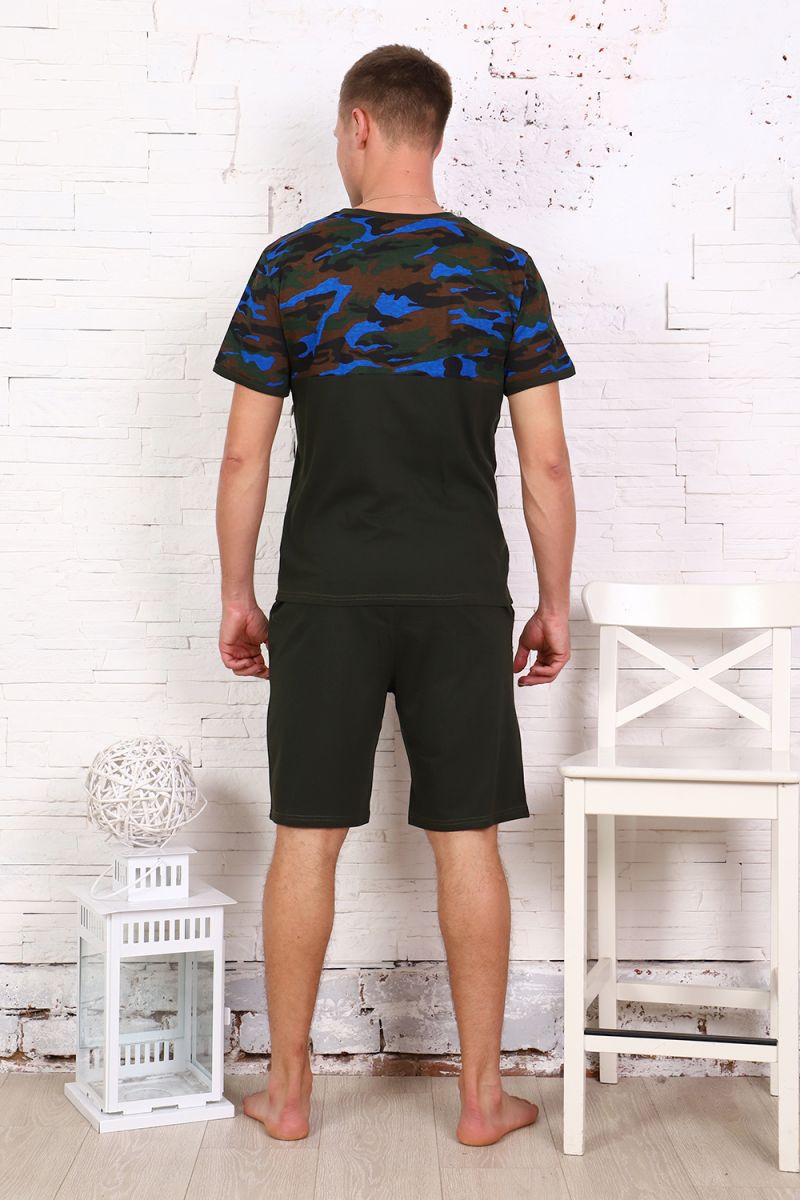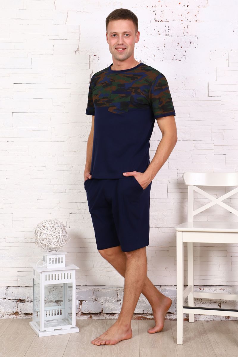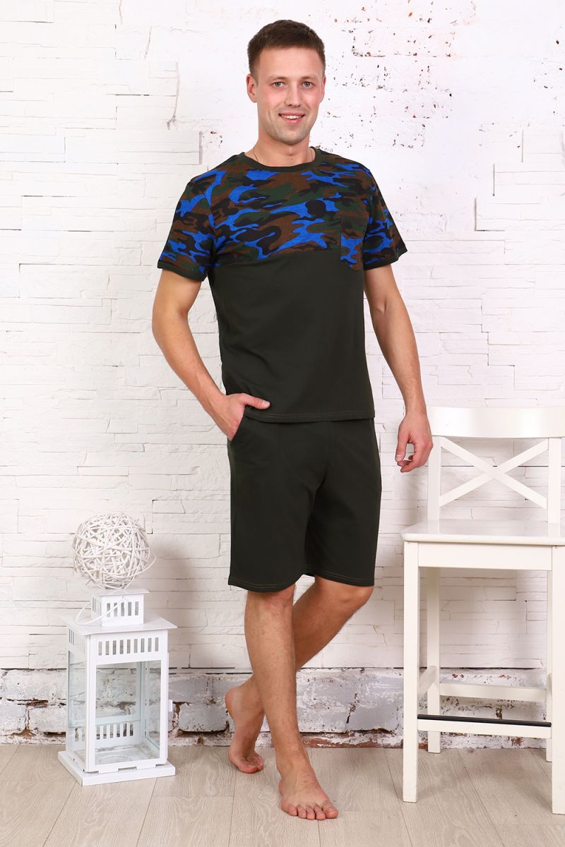 Мужской костюм: футболка +шорты. Изделие из трикотажного полотна, 100% хлопок. Футболка с круглой горловиной, на груди накладной карман, рукава короткие. Шорты до колена на резинке с боковыми карманами. Удобный и практичный костюм.