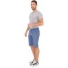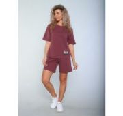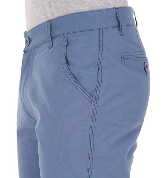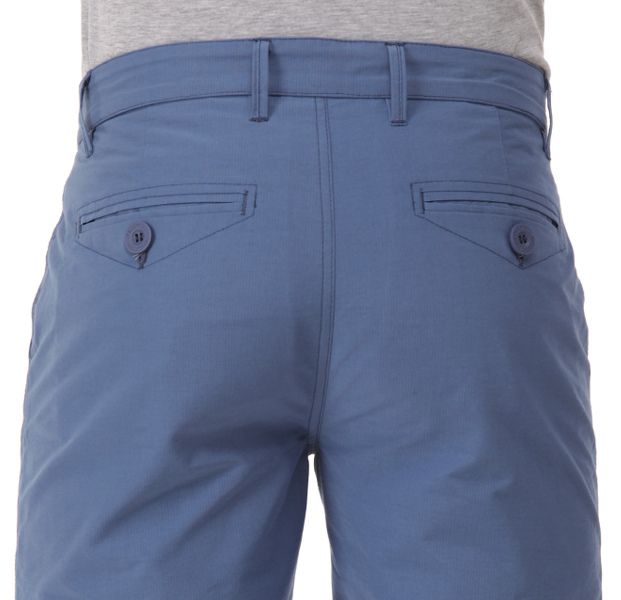 Шорты с жёстким поясом и гульфиком из хлопковой ткани твилового плетения с добавлением спандекса. Лицевая сторона ткани гладкая, изнаночная имеет рельефную структуру в виде мелкого рубчика, который просматривается снаружи в виде узких полос. Лекало молодёжное зауженное. Пояс со шлёвками под ремень. Бока отстрочены тройным швом. Передние карманы полукруглые, отделаны по краю тонким кантом. Справа дополнительный карман – пистон. Задние карманы выполнены в рамочку, отстрочены по контуру, закрываются пуговицами. Изделие прошло влажно-термическую обработку.