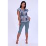 Домашний женский костюм изготовлен из кулирки - 100% хлопка. Женский костюм состоит из майки и брюк. Майка полуприлегающего силуэта с округлой горловиной. Бриджи прилегающие с карманами, притачным поясом, низ обработан на плоскошовной машине.