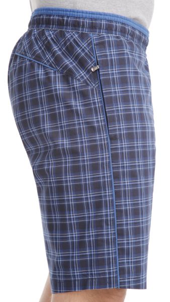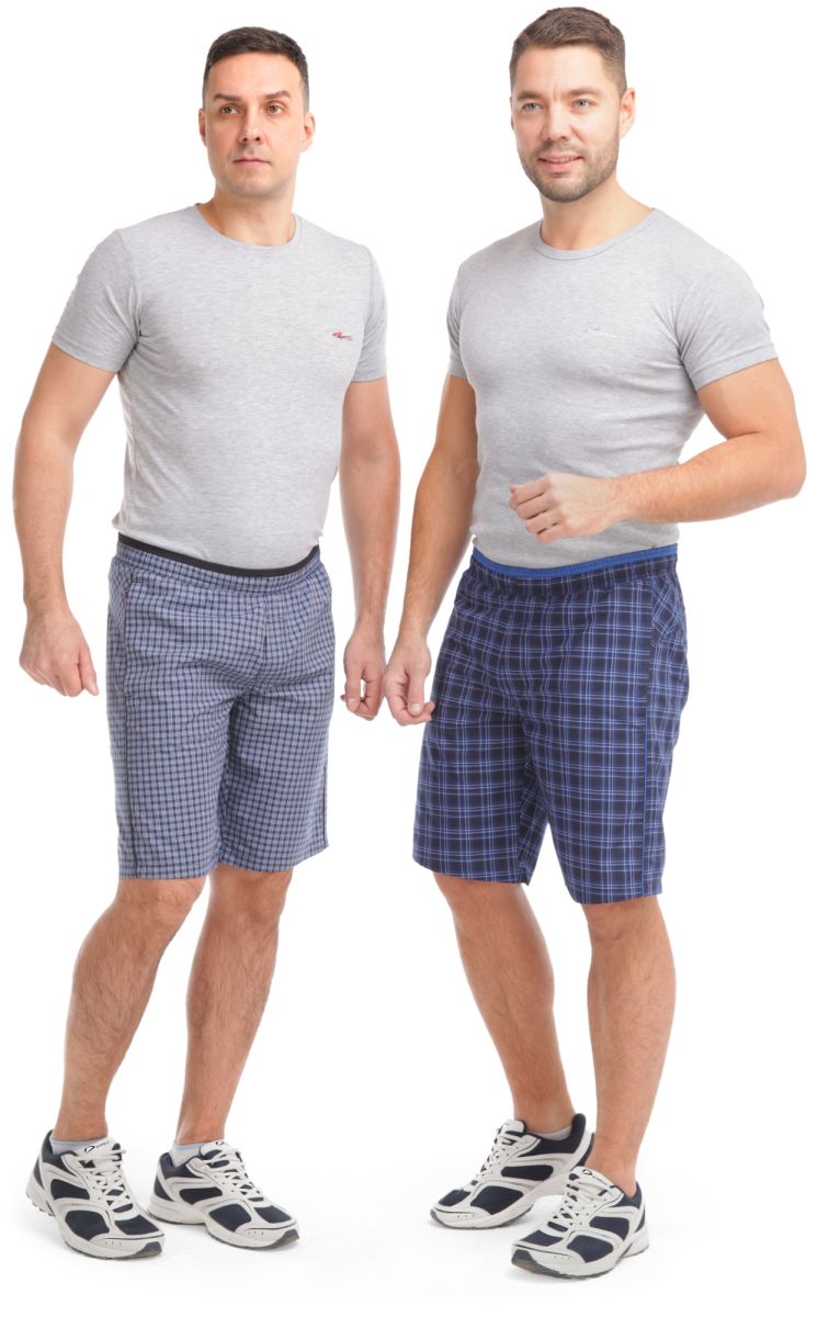 Шорты для отдыха из ткани в цветную клетку с 2-х цветным поясом на резинке. Длина – по колено. С внутренней стороны пояс фиксируется шнурком. Передние карманы на молниях под листочками. Сзади кокетка, в шов которой вставлены отрезки цветного канта. Цвет – в тон отделки. 9 вариантов дизайна материала.