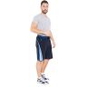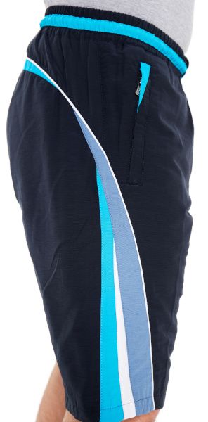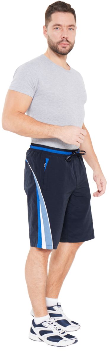 Шорты для отдыха с 2-х цветным поясом на резинке. Длина – по колено. Для дополнительной фиксации с наружной стороны в пояс вставлен шнурок с наименованием торговой марки. Псевдогульфик. В боковые рельефы брючин, переходящие в заднюю кокетку, вшиты полукруглые декоративные элементы 3-х цветов и светло-серый кант. Передние карманы на молниях под листочками с цветными вставками.