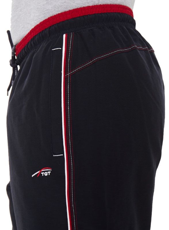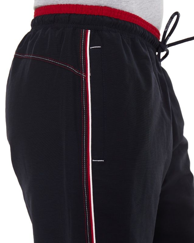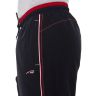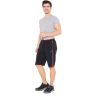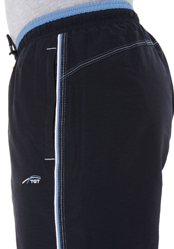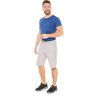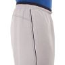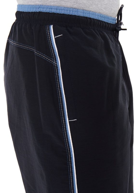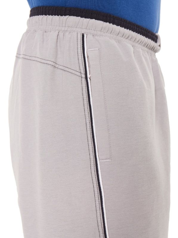 Спортивные шорты с двухцветным поясом на резинке. Длина –по колено. Для дополнительной фиксации с наружной стороны в пояс вставлен шнурок с наименованием торговой марки. Псевдогульфик. Передние карманы на молниях под листочками, декорированными светло-серыми закрепками. Боковые швы отстрочены тремя цветными нитками: центральный – светло-серый, по краям гранат (парламент). В швы вставлены цветные канты: светло-серый/гранат (парламент). Сзади кокетка, отсроченная аналогично бокам. Под левым передним карманом вышивка в фирменном стиле.