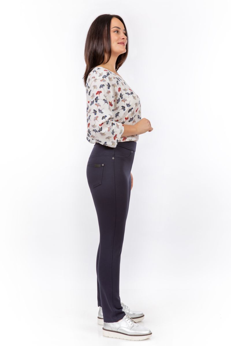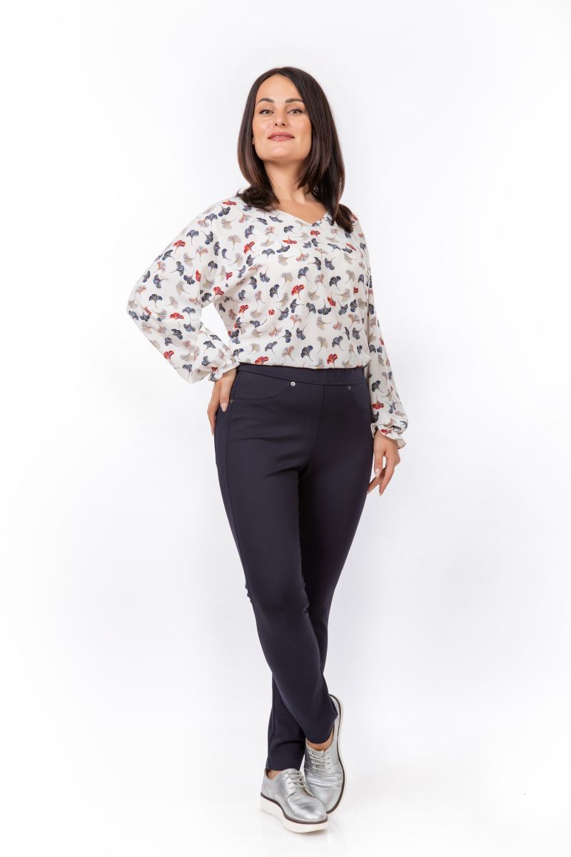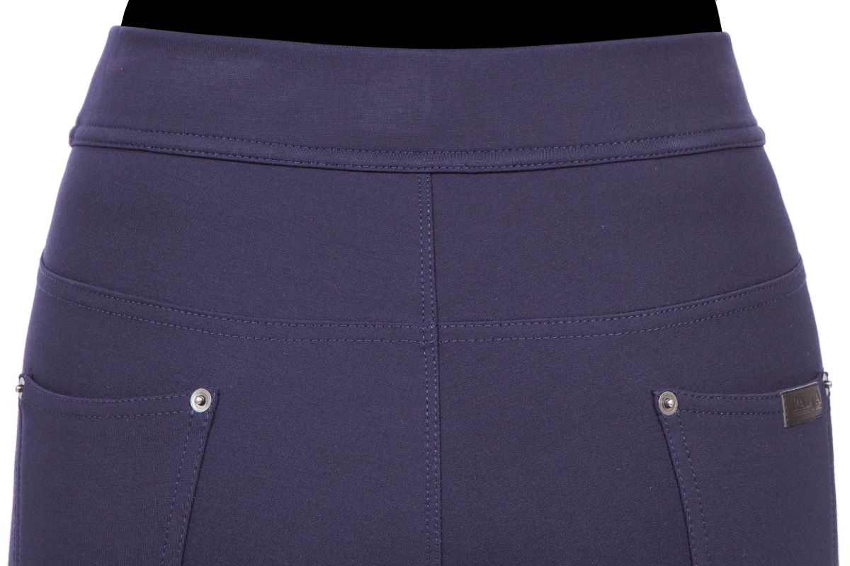 Брюки плотного облегания из трикотажного полотна. Передние половинки украшены отрезным бочком, на задних половинках действующие карманы.