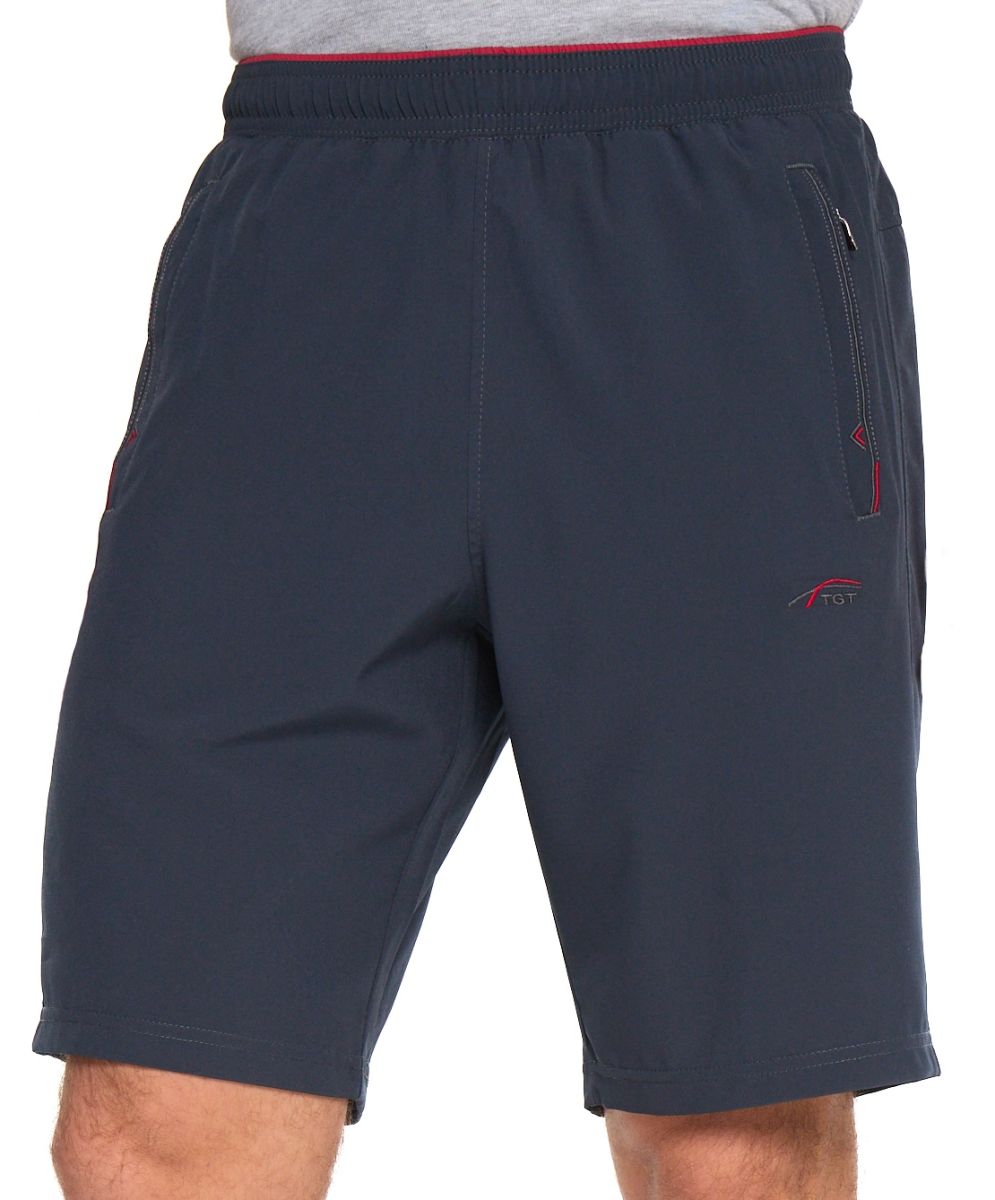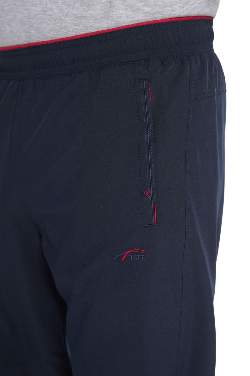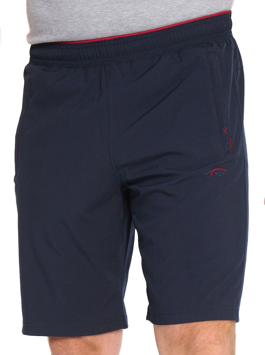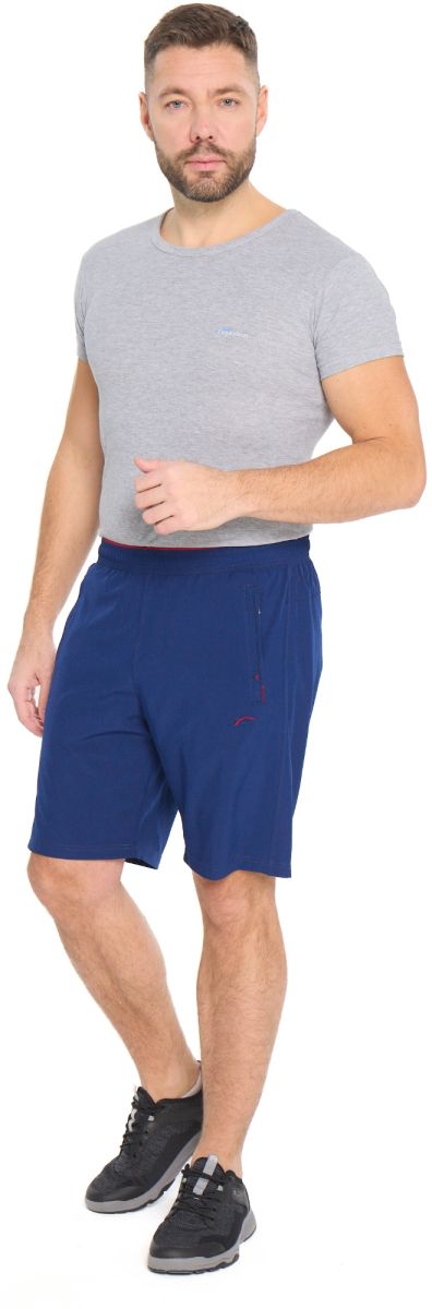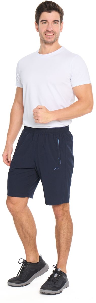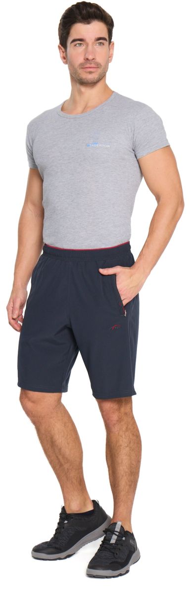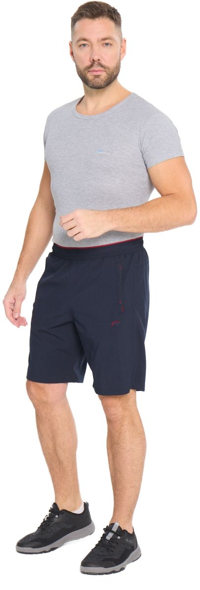 Длина до колена. Для дополнительной фиксации с внутренней стороны в пояс вставлен шнурок. Отшиты из тонкого гладкого синтетического материала (бистреч). Нити эластана расположены как по утку, так и по основе ткани, что придаёт материалу чрезвычайную подвижность, формоустойчивость и комфорт в носке. Передние карманы фиксируются молниями в цвет основного материала. Молнии прикрыты листочками, декорированными вышивками. Под левым карманом вышивка в фирменном стиле.