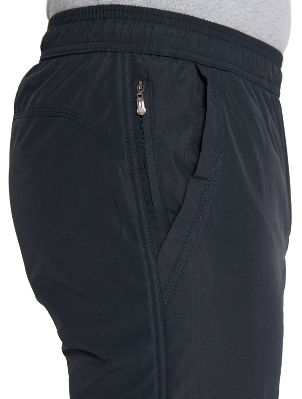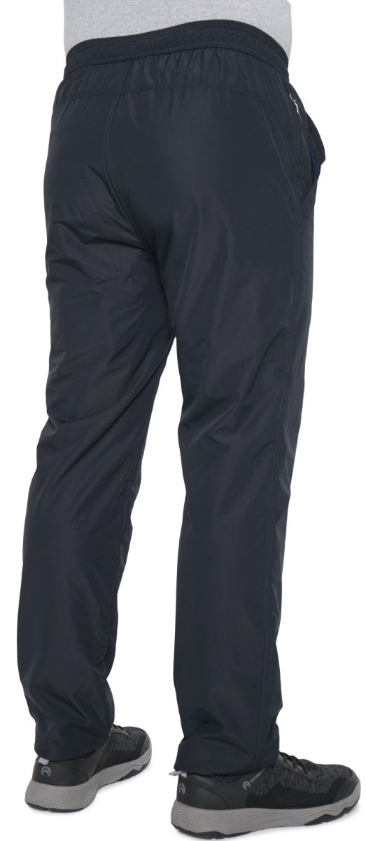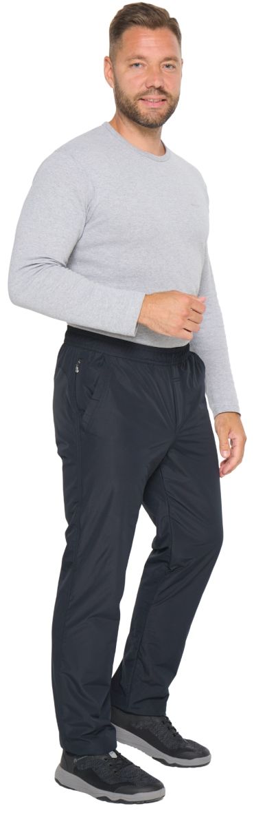 Зимние брюки с поясом на резинке. С внутренней стороны пояс фиксируется шнурком. Наружная ткань мягкая, приятная на ощупь, имеет в своём составе армирующие нити, придающими ей дополнительную прочность и создают фактурный рисунок в виде мелких квадратов. Не грубеет на морозе. Ламинированное покрытие на внутренней стороне ткани обеспечивает защиту от ветра и влаги. Утепляющая подкладка из плотного флиса на трикотажной основе не вытягивается, держит форму, а благодаря антипиллинговой обработке не скатывается даже после многочисленных стирок. Брючины немного заужены книзу. Имитация гульфика. Передние карманы прямые открытые, отстрочены вдоль линии входа. У входа в правый передний карман параллельно боковому шву расположен дополнительный вертикальный карман на молнии в «рамку. Сзади кокетка.